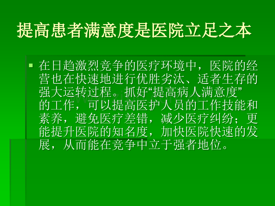 如何提高患者满意度如何提高患者满意度明光市人民医院明光市人民医院 提高患者满意度是医院立足之本提高患者满意度是医院立足之本在日趋激烈竞争的医疗环境中,医院的经营也在快速地进行优胜劣汰、适者生存的强大运转过程。抓好“提高病人满意度”的工作,可以提高医护人员的工作技能和素养,避免医疗差错,减少医疗纠纷;更能提升医院的知名度,加快医院快速的发展,从而能在竞争中立于强者地位。上海某医院每月都进行大规模的门诊满意上海某医院每月都进行大规模的门诊满意度调查:把调查结果进行分析,发现非常度调查:把调查结果进行分析,发现非常满意的患者再次就诊的愿望比满意的患者满意的患者再次就诊的愿望比满意的患者高出高出5倍;越是满意的患者越是有着更高倍;越是满意的患者越是有着更高的忠诚度。的忠诚度。滁州地区从滁州地区从7 7月份开始通过信息平台对十几家医月份开始通过信息平台对十几家医院出院患者进行满意度调查反馈,我院的情况不院出院患者进行满意度调查反馈,我院的情况不容乐观。容乐观。具体不满意原因体现在以下几个方面:一是对医具体不满意原因体现在以下几个方面:一是对医疗技术不满意,二是对服务态度不满意,三是对疗技术不满意,二是对服务态度不满意,三是对卫生环境不满意,四是对费用方面过高不满意。卫生环境不满意,四是对费用方面过高不满意。随着患者的自身保护意识和法律意识大大增加,随着患者的自身保护意识和法律意识大大增加,患者的医疗需求不断提高,不仅要求医务工作者患者的医疗需求不断提高,不仅要求医务工作者有过硬的业务技术水平,而且要求有优质的服务有过硬的业务技术水平,而且要求有优质的服务态度,服务态度直接影响着患者的满意度态度,服务态度直接影响着患者的满意度 当然,满意度的提高需要通过医院所有员工的努当然,满意度的提高需要通过医院所有员工的努力,每个人必须认识到这一点,从自身做起,从力,每个人必须认识到这一点,从自身做起,从服务态度、技术水平等各方面提升自身素质,才服务态度、技术水平等各方面提升自身素质,才可能为患者提供优质服务,提高满意度。可能为患者提供优质服务,提高满意度。满意感的定义满意感的定义患者满意感广义是指患者对服务结果的感患者满意感广义是指患者对服务结果的感受以及由这种感受导致的情绪反应的总和。受以及由这种感受导致的情绪反应的总和。患者的需要获得满足后产生的心理患者的需要获得满足后产生的心理和情绪的良好反应。和情绪的良好反应。患者的满意感患者的满意感患者满意感既包括认知成分,也包含情感成分。患者满意感既包括认知成分,也包含情感成分。患者满意感既包括认知成分,也包含情感成分。患者满意感既包括认知成分,也包含情感成分。认知成分是指患者将服务实绩与某一标准比较的认知成分是指患者将服务实绩与某一标准比较的认知成分是指患者将服务实绩与某一标准比较的认知成分是指患者将服务实绩与某一标准比较的过程。过程。过程。过程。情感成分是指患者将服务实绩与某一标准比较后情感成分是指患者将服务实绩与某一标准比较后情感成分是指患者将服务实绩与某一标准比较后情感成分是指患者将服务实绩与某一标准比较后产生的心理反应,如满足、高兴、喜欢、感动等。产生的心理反应,如满足、高兴、喜欢、感动等。产生的心理反应,如满足、高兴、喜欢、感动等。产生的心理反应,如满足、高兴、喜欢、感动等。可能是患者对其治疗经历过程中的某一可能是患者对其治疗经历过程中的某一个具体服务属性的满意感;个具体服务属性的满意感;可能是患者对其在医院所有治疗经历的可能是患者对其在医院所有治疗经历的总体满意感;总体满意感;总体满意感是多数患者认知肯定的结果。总体满意感是多数患者认知肯定的结果。因为患者是否再次去某个医院诊治,往因为患者是否再次去某个医院诊治,往往不是其治疗经历过程中的某一次具体往不是其治疗经历过程中的某一次具体特定的治疗或环节所决定的。特定的治疗或环节所决定的。患者的满意感患者的满意感在在“以患者为中心以患者为中心”的医院服务营销过的医院服务营销过程中,理解和把握患者的就诊心理,对程中,理解和把握患者的就诊心理,对就诊医院的选择,对就诊过程的评价是就诊医院的选择,对就诊过程的评价是医院研究患者满意度的重要前提。医院研究患者满意度的重要前提。患者的整个就诊过程包括就诊前、就诊患者的整个就诊过程包括就诊前、就诊中和就诊后。在就诊的每个阶段中均存中和就诊后。在就诊的每个阶段中均存在着影响患者最终满意度的一系列关键在着影响患者最终满意度的一系列关键要素。要素。就诊三个阶段的服务就诊三个阶段的服务诊前阶段:诊前阶段:从患者对医院的一系列判断与评估开始。从患者对医院的一系列判断与评估开始。从患者对医院的一系列判断与评估开始。从患者对医院的一系列判断与评估开始。患者主要活动内容是:信息收集患者主要活动内容是:信息收集患者主要活动内容是:信息收集患者主要活动内容是:信息收集风险判断风险判断风险判断风险判断选选选选择就诊医院择就诊医院