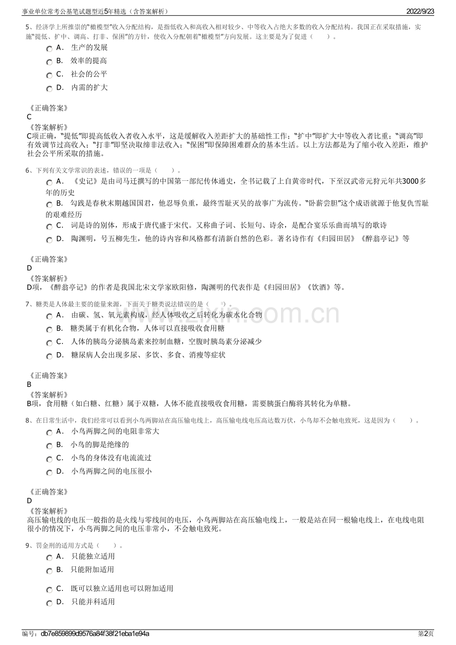 事业单位常考公基笔试题型近5年精选(含答案解析)一、第一部分 常识判断 (根据题目要求,在四个选项中选出一个最恰当的答案。)1、雾凇是我国北方冬季一种常见的自然现象。下列有关雾凇的说法错误的一项是()。 A 我国是最早记载雾凇的国家,在春秋一书中就有相关的记载,但是“雾凇”一词在南北朝时期才正式出现 B 雾凇是一种类似霜降的自然现象,我国一般只有在北方才能看到这种冰雪美景 C 雾凇是一种非常迷人的自然景象,但是它有时候也会成为自然灾害 D 雾凇是在空气层中水汽直接凝华,或过冷却雾滴直接冻结在地物迎风面上的乳白色冰晶正确答案B答案解析B项错误,雾凇在我国南方高山地区也很常见,只要雾中有过冷却水滴,并达到一定温度就可以形成。A项正确,春秋中有关于“树稼”的记载,其实就是现在所称的雾凇。“雾凇”一词最早出现于南北朝时期吕忱所编的字林中。C项正确,严重的雾凇有时候会将电线、树木压断,造成损失。D项正确,雾凇是在空气层中水汽直接凝华,或过冷却雾滴直接冻结在地物迎风面上的乳白色冰晶。2、下列关于日常生活中的光学知识,表述不正确的是()。 A 夜晚用手电筒照射镜子和白纸,从侧面观察将发现镜子比白纸暗 B 一束红色光和一束绿色光同时通过绿色玻璃投射在对面的绿色纸屏上,纸屏会变亮 C 在空气中,由于光是沿直线传播的,所以不能在垂直于光束的方向看到光束 D 从水中看位于岸上的景物,则景物的位置显现得要比实际的高正确答案C答案解析C项,我们能在垂直于光束的方向看到一条呈直线的光束,那是由于空气中含有大量的杂质,其对光的散射能力要比空气分子大得多,因此就会有很多的光子经过散射后进入到人的眼睛,从而使人看到光束。3、下列叙述中正确的是()。 A 太阳黑子多时,太阳活动强度小 B 人工降雨时,往云层中撒播干冰,可以增加云层的湿度,促使降雨 C 如果月球有和地球同样的大气层,月球上的环形山会比实际少 D 我们肉眼所看到的太阳是太阳的色球层正确答案C答案解析C项正确,环形山形成的原因是流星体撞击月球,若有大气层则流星体在进入大气层时会被燃烧掉,月球上的环形山会比实际少。A项错误,太阳黑子多时,太阳活动强度大。B项错误,撒干冰不是为了湿度,而是降温,促使大气中的水蒸气凝结并附着在云层的小雾滴之上,形成水滴而降雨。D项错误,我们肉眼所看到的太阳是太阳的光球层。4、下列医学常识叙述正确的是()。 A 静脉受伤出血时,包扎的位置应在远心端 B 用牛奶送服药物可促进吸收 C 测血糖时,应在酒精消毒后立即取血 D 骨折时不能使用夹板固定患处,以防止阻塞血液流通正确答案A答案解析B项,牛奶服药容易使药物表面形成覆盖膜,使牛奶中的钙与镁等矿物质离子与药物发生化学反应,生成非水溶性物质,这不仅降低了药效,还可能对身体造成危害;C项,取血部位酒精消毒后,须等酒精挥发后再采血,以避免酒精与试纸条上的物质发生化学反应,导致血糖检测值不准确;D项,骨折时应迅速使用夹板固定患处,但固定不应过紧。事业单位常考公基笔试题型近5年精选(含答案解析)2022/9/23编号:db7e859899d9576a84f38f21eba1e94a第1页5、经济学上所推崇的“橄榄型”收入分配结构,是指低收入和高收入相对较少、中等收入占绝大多数的收入分配结构。我国正在采取措施,实施“提低、扩中、调高、打非、保困”的方针,使收入分配朝着“橄榄型”方向发展。这主要是为了促进()。 A 生产的发展 B 效率的提高 C 社会的公平 D 内需的扩大正确答案C答案解析C项正确,“提低”即提高低收入者收入水平,这是缓解收入差距扩大的基础性工作;“扩中”即扩大中等收入者比重;“调高”即有效调节过高收入;“打非”即坚决取缔非法收入;“保困”即保障困难群众的基本生活。以上方法都是为了缩小收入差距,维护社会公平所采取的措施。6、下列有关文学常识的表述,错误的一项是()。 A 史记是由司马迁撰写的中国第一部纪传体通史,全书记载了上自黄帝时代,下至汉武帝元狩元年共3000多年的历史 B 勾践是春秋末期越国国君,他忍辱负重,最终雪耻灭吴的故事广为流传。“卧薪尝胆”这个成语就源于他复仇雪耻的艰难经历 C 词是诗的别体,形成于唐代盛于宋代。又称曲子词、长短句、诗余,是配合宴乐乐曲而填写的歌诗 D 陶渊明,号五柳先生,他的诗内容和风格都有清新自然的色彩。著名诗作有归园田居醉翁亭记等正确答案D答案解析D项,醉翁亭记的作者是我国北宋文学家欧阳修,陶渊明的代表作是归园田居饮酒等。7、糖类是人体最主要的能量来源,下面关于糖类说法错误的是()。 A 由碳、氢、氧元素构成,经人体吸收之后转化为碳水化合物 B 糖类属于有机化合物,人体可以直接吸收食用糖 C 人体的胰岛分泌胰岛素来控制血糖,空腹时胰岛素分泌减少 D 糖尿病人会出现多尿、多饮、多食、消瘦等症状正确答案B答案解析B项,食用糖(如白糖、红糖)属于双糖,人体不能直接吸收食用糖,需要胰蛋白酶将其转化为单糖。8、在日常生活中,我们经常可以看到小鸟两脚站在高压输电线上,高压输电线电压高达数万伏,小鸟却不会触电致死,这是因为()。 A 小鸟两脚之间的电阻非常大 B 小鸟的脚是绝缘的 C 小鸟的身体没有电流流过 D 小鸟两脚之间的电压很小正确答案D答案解析高压输电线的电压一般指的是火线与