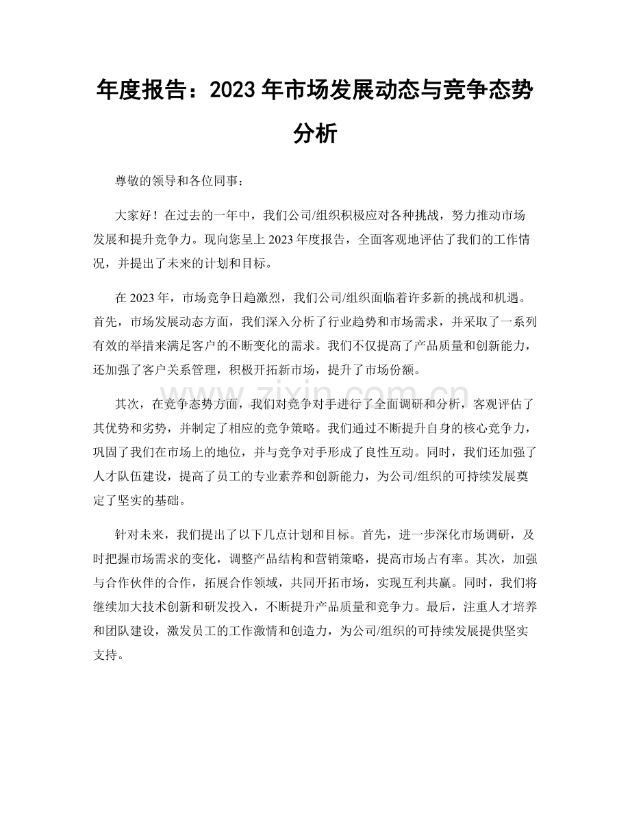 大家好!在过去的一年中,我们公司/组织积极应对各种挑战,努力推动市场发展和提升竞争力。现向您呈上2023年度报告,全面客观地评估了我们的工作情况,并提出了未来的计划和目标。