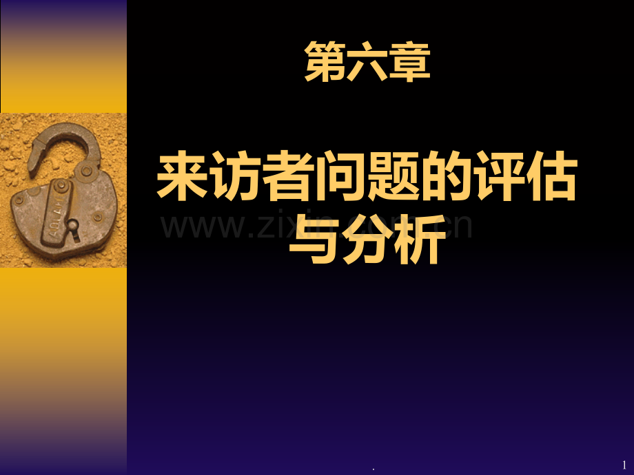 第六章来访者问题的评估与分析1.来访者问题的评估与分析一评估来访者问题的一般程序二适宜咨询对象的选择与转介三来访者问题的评估与分析四评估来访者问题的主要手段2.成长有一个过程,咨询也有一个过程3.评估来访者问题的一般程序 来访者咨询内容概况 是否属于精神病、严重人格障碍或脑器质性病变是否有关检查否是否适宜咨询对象是是否转介制定咨询计划介绍到精神科或神经科 分析、确认来访者问题4.适宜咨询对象的选择与转介一、适宜咨询对象的特点具有基本正常的智力基础年龄适宜:青年人比其他年龄的求助者更适合心理咨询内容合适人格基本正常动机正确对自身问题的责任感强注重心理感受有良好的外部支持对症状表现出苦恼、焦虑与恐惧交流的能力较强对咨询的信任度高匹配性好5.心理健康中的“灰色区”概念示意图:各种非病理性精神痛苦之总和各种病理性精神痛苦之总和 纯白浅灰深灰纯黑人员健康人格各种由生活人际各种变态人格精神病自信心高关系压力而产生与人格异常患者适应力强心理冲突之人与障碍之人服务无需心理咨询员心理医师精神科人员社会工作者心理门诊大夫大夫服务无需咨询心理学临床心理学医学模式模式模式模式心理咨询的对象是处于“浅灰色”的人群。6.咨询对象的转介哪些来访者需要转介:咨询内容与咨询者不匹配;价值观念与咨询者不相容;个性与咨询者不相容;与咨询者有私人关系;来访者有特殊背景7.必要的转介 求助者与咨询师不相适宜的情况有以下三类:1欠缺型由于咨询师的训练重点不一,擅长内容不一,因而,对某些类型的咨询内容很可能不懂、不擅长。2忌讳型指有些咨询师在价值观念上、情感方式上很可能对某些人、某些咨询内容持有某种程度的敏感、偏见、忌讳,很容易走入误区。咨询师本人也应该常接受督导,以提高自己的心理健康水平,更能宽容各种不同的价值观念、思维方式3冲突型咨询师与求助者可能在个性等方面存在着某种不协调。有些求助者对咨询师信奉的某种理论方法持不信任态度,那么就不能使用该方法咨询。8.在无法实现匹配的情况下转介咨询师如果发现自己与求助者明显不相适宜,或发现自己不善处理时,就应该以高度的责任感和良好的职业道德,明智地转介给合适的咨询师,或及时中止咨询,推荐其去寻找更有效的帮助。在把求助者推荐给他人时,须持慎重的态度,防止出现对求助者的伤害和负面影响。须事先征求求助者的意见,并说明理由,但说明理由时须尊重求助者,不可过于直率。对转介的新咨询师,应详细地介绍情况,提供自己的分析,但不宜泄露求助者出于对原咨询师的信任而提供的隐秘。必要时,原咨询师还可出于关心,询问以后的咨询情况。但一般不得干预新咨询师的咨询活动,不宜在求助者面前对新咨询师的方法、为人等评头论足,更不能指责,不然就会损害新咨询师的形象,影响新咨询关系的建立,进而影响咨询效果。9.来访者问题的评估与分析一、来访者一般情况和背景信息二、来访者求助解决的问题三、问题产生的原因四、对问题的分析10.1、一般资料A、求助者的人口学资料B、求助者的生活状况C、婚姻家庭D、工作记录E、社会交往F、娱乐活动G、自我描述H、内在世界的重要特点一、来访者一般情况和背景信息11.2、个人成长史资料A、婴幼儿期B、童年期C、少年期D、青年期E、个人成长中的重大变化及现在对它的评价3、求助者目前精神、身体、社会状态一、来访者一般情况和背景信息12.二、来访者求助解决的问题(1)“who”,他是谁?(2)“what”,发生了什么事?(3)“when”,什么时候发生的?(4)“where”,在哪里发生的?(5)“why”,为什么会发生?(6)“which”,与哪些人相关?(7)“how”,事情是如何演变的?13.问题产生的原因精神分析途径;反射-行为-学习路径;人本主义途径;认知途径;生物医学途径;社会文化途径14.对问题的分析 把问题具体化;分清表面问题与深层次问题15.评估来访者问题的主要手段心理测验主要手段诊断性会谈16.心理测验常用心理测验;常用评定量表17.诊断性会谈诊断性会谈的特点;诊断性会谈的方式;诊断性会谈的要领18.案例介绍 徐某,男,19岁,某中学高二学生。由于家境不好,自己从小觉得受歧视,觉得“世上哪有我这样不幸的人”。进入初中,认为父亲得过精神病是“家丑”,不让他参加家长会。由于徐某学习不好,初一老师经常罚他,并封他为班上“第2号呆子”,他非常恨该老师,同时更感自卑。初二时,他得了慢性肾炎,休学一年;回校后,成绩仍差,身体也一直不好,更觉自己无用,周围人都看不起他。初三起即产生想死的念头,并具体设想了如何死法,但没有勇气。进入高中后,一切均无改善,对社会、家庭,对人生,对自己极度悲观失望,提不起精神去上学,也不想上学,觉得自己是社会中多余的人,还是死了好。19.案例介绍 下面是他的一段诉说:“我从小受歧视,养成内向性格;我自卑又自尊,很留意别人对我的评价;我什么都不行,身体、成绩、家庭;同学们对社会充满希望,我却很悲观;世上小人太多,话说多了就会遭到歧视;我不敢反驳别人,见人低着头走,我要保护自己;我身体不好,痛苦多,随它去,死了算了;达尔文说适者生存,我不适就让社会淘汰吧,我是过一天算一天,还上什么学,死了好!但我母亲对我好,我不能死在她面前(哽咽),我为母亲