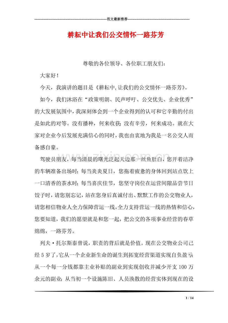 今天,我演讲的题目是《耕耘中,让我们的公交情怀一路芬芳》。