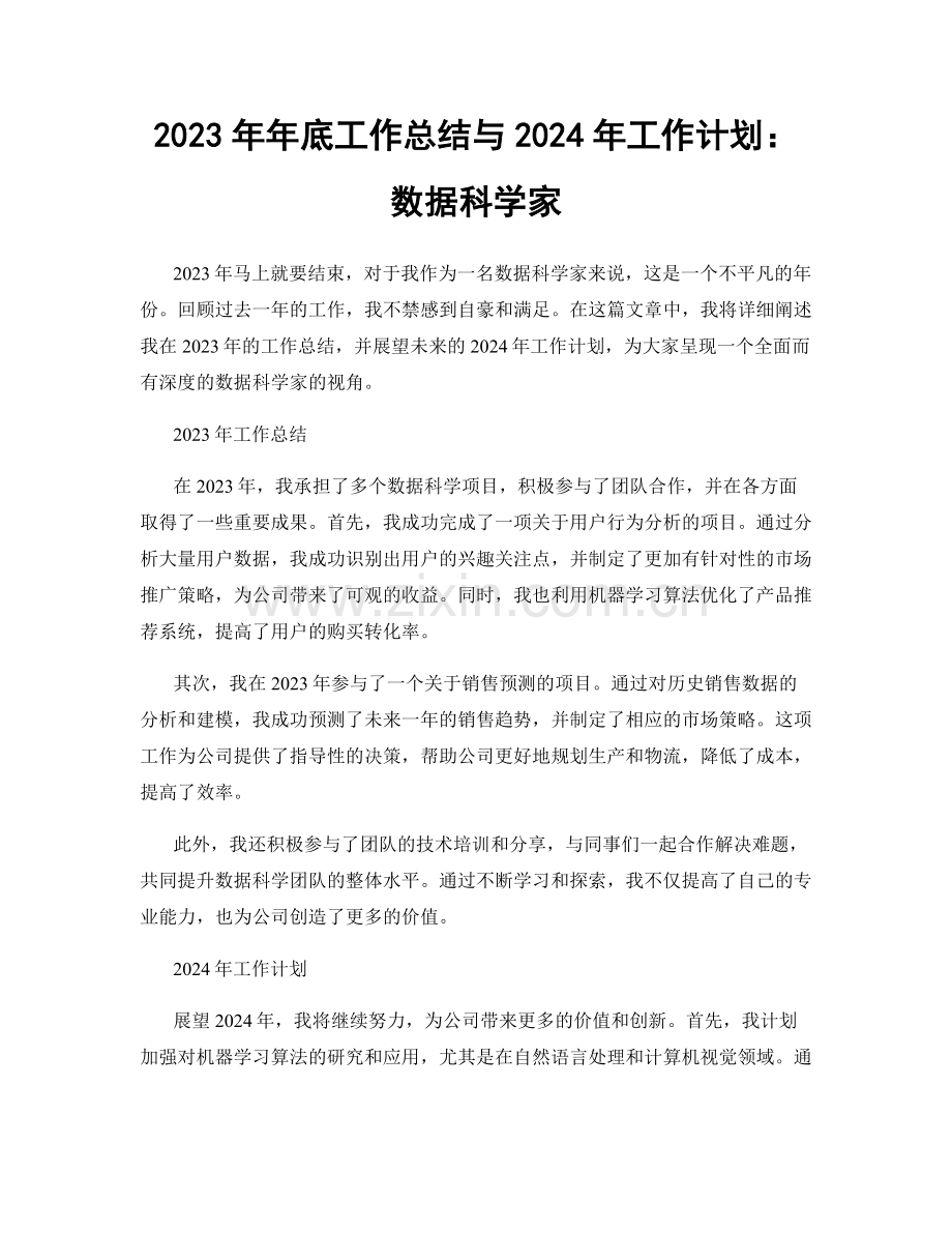 作为一名数据科学家,我深知自己承担着分析数据、提供决策支持和创造价值的责任。在2023年,我通过参与多项目的实践,积极与团队合作,取得了一些重要成果。展望2024年,我将继续努力,加强个人技能的提升,与业务团队紧密合作,为公司带来更多的价值和创新。通过不断学习和探索,我相信我可以在数据科学领域取得更大的成就,为公司的发展贡献力量。