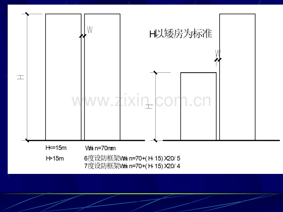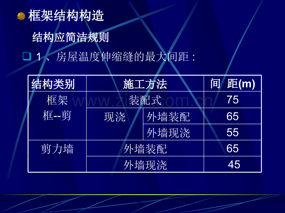 框架结构构造框架结构构造结构应简洁规则结构应简洁规则q 1、房屋温度伸缩缝的最大间距:结构类别结构类别 施工方法施工方法 间间 距距(m)框架框-剪 装配式 75现浇 外墙装配 65外墙现浇55剪力墙 外墙装配 65外墙现浇 45q 2、房屋防震缝的最小宽度(mm):防震缝与设防烈度、结构形式、相邻较低房屋高度有关防震缝宽度-以框架为基准a、框架结构:高度 15m部分,防震缝的最小宽度70mm 高度 15m部分,6,7,8,9度相应每增加高度 5,4,3,2m防震缝宜加宽20mm b、框架剪力墙结构,按框架结构的70%采用,且防震缝的最小宽度70mmc、剪力墙结构,按框架结构的50%采用,且防震缝的最小宽度70mma、h or b1/151/20b、hH/12 b、外筒柱间隔=400 1、平面应简单合理:矩形、圆形为好,正六(八)边形、椭圆、扇形也可以高层结构布置要点 q一、有利的房屋体形*复杂与规则复杂与规则a、+、井字等外伸较大,必要时设连接梁、井字等外伸较大,必要时设连接梁b、凹入或开洞尺寸不宜大于楼面宽度的凹入或开洞尺寸不宜大于楼面宽度的1/2c、3.开洞面积不宜超过楼面总面积的开洞面积不宜超过楼面总面积的30%d、开洞后最小净宽不小于开洞后最小净宽不小于5m,且每边楼板净且每边楼板净宽不小于宽不小于2m 2、立面变化均匀*矩形、梯形、三角形渐变良好*倒梯形 a.下部结构弱 b.重心高,倾覆力矩大 c.P-效应严重*大底盘 主楼与裙房交接处刚度差异大,如裙房不对称更不利3、立面限制 上层/下层B1/B0.75 L1/L0.75 H1/H0.75 4、合适的房屋高度5、不大的房屋高宽比6、足够的基础埋深 一般D/H1/12 桩基D/H1/157、防震缝的合理设置q二、合利的结构布置1、结构力求对称 减少扭转震害;抗震墙宜沿周边布置2、结构竖向要等强A定义:楼层屈服强度系数y是楼层受剪承载力标准值(屈服剪力)与结构弹性地震反应楼层剪力之比值。等强是指各楼层y大致相等,因而具有较好的耐性。3、避免柔弱底层4、避免短柱5、变截面抗震墙的应用q三、屋顶小楼的合理 鞭梢效应 q四、合理运用材料 q五、多道防线 q六、强柱弱梁 q七、轻质高强 q八、妥善处理非结构构件 q中央银行与美洲银行对比eg1 q一、主动抗震eg21、隔震 2、阻尼q一、主动抗震第四章第四章 其它高层结构体系其它高层结构体系 1、巨型桁架结构2、巨型框架结构3、悬挂结构4、悬挑结构5、预应力 蒙皮结构q二、巨型结构 1、带转换层带转换层高层建筑高层建筑结构结构 2、带加强层带加强层高层建筑高层建筑结构结构 3、错层结构4、连体结构5、多塔楼多塔楼结构q三、复杂高层建筑结构高层建筑结构