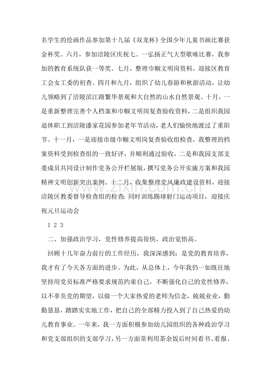 回顾十几年奋力前行的工作经历,我深深感到:是党的教育培养,我才有了今天各方面的进步。为此,从总体上,今年我仍一如既往地坚持用党员标准严格要求规范约束自己,不断强化自己的党性修养,以不辜负党的期望,以做一个大家热爱的老师为信念,兢兢业业,勤勤恳恳,踏踏实实地工作,把自己的全部精力投入到了自己热爱的幼儿教育事业。一年来,我一方面积极参加幼儿园组织的各种政治学习和党支部组织的支部学习,另一方面常利用茶余饭后时间看书、看报、看时事新闻和法制报道,从而使自己在遵纪守法的同时懂得如何应用法律武器维护自己的合法权益。本年度,我严格遵守、执行幼儿园规章制度,岗位职责明确,处处以工作为重,以集体利益为重,工作积极主动,任劳任怨,为人师表,团结同事,对待家长和蔼可亲,对待幼儿一视同仁。同时我还经常利用课余时间主动帮助跟自己同班和同年级组的新老师,帮助其树立良好的幼教职业道德观和人生观,对工作职责以外的事务,从不计名利,不计报酬。全学年无病事假和早退,无重大安全事故发生。
