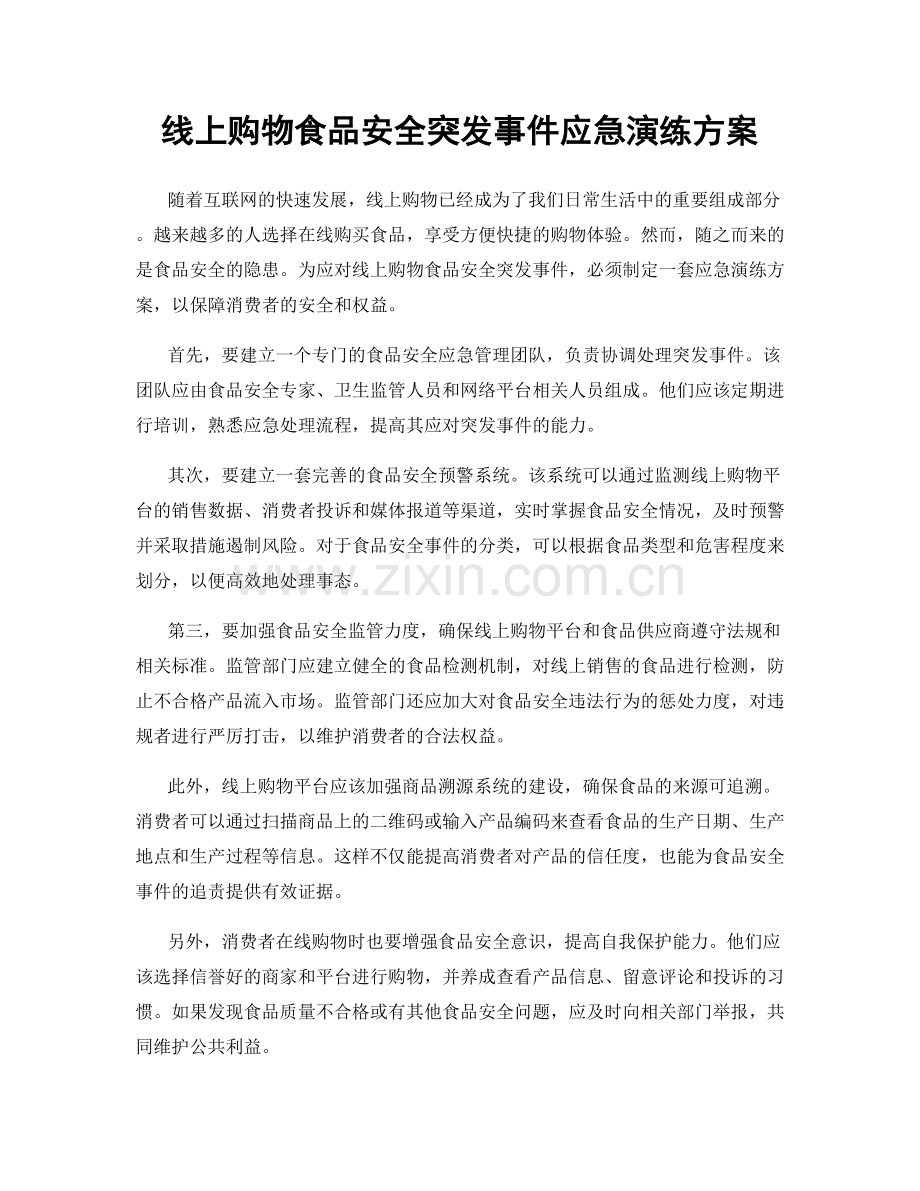 综上所述,线上购物食品安全突发事件应急演练方案需要一个专门的管理团队、完善的预警系统、强化的监管力度、健全的商品溯源系统和公众的参与。只有通过多方合作,才能够有效地应对线上购物食品安全突发事件,保障消费者的安全和权益。