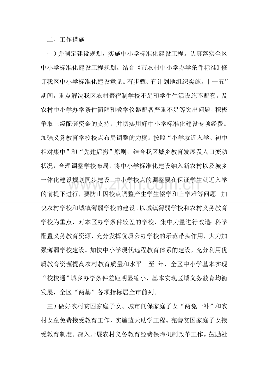 一)并制定建设规划,实施中小学标准化建设工程。认真落实全区中小学标准化建设工程规划。结合《市农村中小学办学条件标准》修订我区中小学标准化建设意见。有步骤、有计划地组织实施。十一五”期间,重点解决我区农村寄宿制学校不足和学生生活设施不配套,及农村中小学办学条件简陋和教学仪器配备严重不足等突出问题,积极争取上级配套资金的支持,并切实用好中小学标准化建设专项经费。加强义务教育学校校点布局调整的力度。按照“小学就近入学、初中相对集中”和“先建后撤”原则,结合我区城乡教育发展及人口变动状况,合理调整学校布局,将中小学标准化建设纳入新农村以及城乡一体化建设规划同步建设。中小学校点的调整要在保证学生就近入学的前提下进行,要防止因校点调整产生学生辍学和上学难等问题。加快农村学校和城镇薄弱学校的建设。以城镇薄弱学校和农村义务教育学校为重点,对本区办学条件较差的学校,集中力量进行改造;科学配置义务教育资源,充分发挥优质公办学校的示范带头作用,大力加强薄弱学校建设。加快中小学现代远程教育体系的建设,充分利用优质教育资源提高农村教育质量和水平。至 年,全区中小学基本实现“校校通”城乡办学条件差距明显缩小,基本实现区域义务教育均衡发展,全区“两基”各项指标居全市前列。
