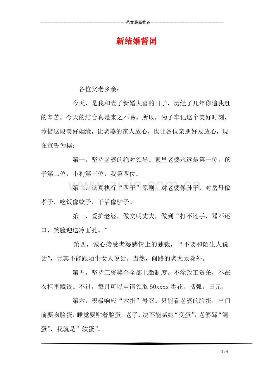今天,是我和妻子新婚大喜的日子,历经了几年你追我赶的辛苦,今天的结合真是来之不易。所以,为了牢记这个美好时刻,珍惜这段美好姻缘,让老婆的家人放心,也让各位亲朋好友放心,现在宣誓为据: