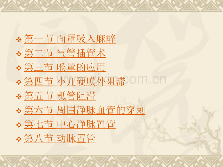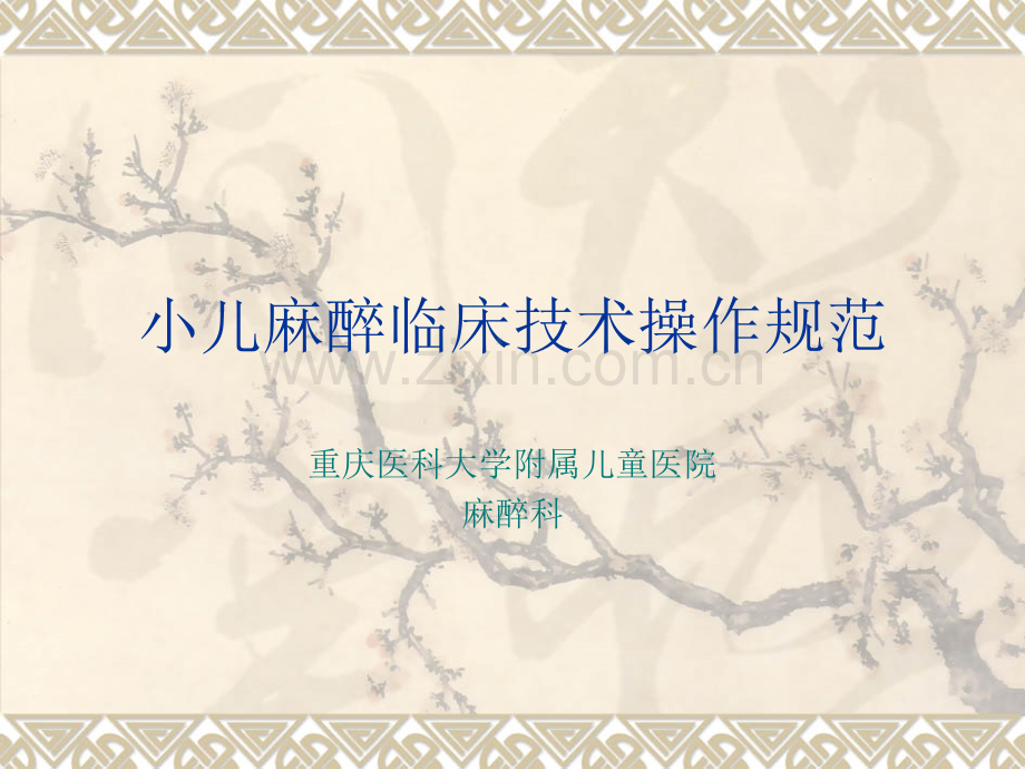 小儿麻醉临床技术操作规范重庆医科大学附属儿童医院麻醉科v第一节 面罩吸入麻醉v第二节 气管插管术v第三节 喉罩的应用v第四节 小儿硬膜外阻滞v第五节 骶管阻滞v第六节 周围静脉血管的穿刺v第七节 中心静脉置管v第八节 动脉置管第一节 面罩吸入麻醉适应症、禁忌症 操作方法 注意事项适应症禁忌症1、通过面罩进行吸入诱导2、短小、简单手术的麻醉3、区域阻滞麻醉的辅助措施1、饱食,腹内压过高,有反流误吸高度危险的患儿2、麻醉时间长面罩通气难以保障者3、颌面部畸形、口咽喉有病理异常、分泌物较多者操作方法v1、面罩吸入麻醉期间,应准备气管插管的各种用具和用药:(1)粗细适合的气管导管 (2)合适的喉镜 (3)阿托品和肌松药v2、选择适合病儿脸形、死腔最小的面罩,以小指为主置下颌角轻托下颌骨,使下门齿超过上门齿,并使嘴张开,保持气道通畅,拇指、示指轻压面罩使面罩边缘紧贴脸部减少漏气,中指、无名指分别放在下颌骨的颏部及下颌支向上略微用力,保持头略后仰,可单手或双手操作。操作方法v3、婴儿相对较大的舌头和小儿肥大的腺样体均可致气道梗阻,可置入大小适合的口咽通气道。口咽通气道根据长度有5#10#,选择可参考口角到下颌角或耳垂的长度。v4、婴幼儿的喉和气管环状软骨较软,在面罩吸入时麻醉科医师的指头易压迫气道,故须不断监测呼吸音、呼气末二氧化碳和呼吸囊的运动。注意事项v1、避免手指在颏下三角区施压,否则可能发生呼吸道受压梗阻、颈部血管受压或颈动脉窦受压刺激。v2、防止面罩边缘对眼睛产生损害。v3、托面罩时可采取头侧位以便于保持气道通畅和分泌物的外流。第二节 气管插管术 适应症操作方法 并发症适应症v1、保障上呼吸道通畅。v2、避免胃内容物误吸。v3、需要长时间正压通气。v4、需要反复吸除气管内分泌物。操作方法1、气管插管前准备2、气管插管术3、拔管术1、气管插管前准备v1、喉镜片有直和弯两种,一般直片用于小婴儿,较大小儿均采用弯片。v2、选择一条无阻力的通过声门和声门下区域的最大气管导管,临床上常通过逐渐增加气道压力观察漏气情况(颈部听诊或感受口中漏气程度)来判断气管导管是否适合,一般要求在气道压力达到2025cmH2O时应有漏气。v3、最好使用薄壁的PVC导管,带有测孔(Murphy eye)的气管导管并不推荐,因会增加分泌物的积聚,容易使气道堵塞。v4、带气囊气管导管比较适合于大手术、需人工通气和反流危险性大的患儿,为了保证良好通气,带气囊气管导管应用越来越普及。v5、小儿气管导管内径和置管深度须根据年龄和发育大小来选择,其常用公式:导管内径=年龄(岁)/4+4;导管插入深度:从中切牙至气管中段距离(cm)=年龄(岁)/2+12,尚须常规准备大一号和小一号的导管各一根,根据声门大小,最后选定内径最适合的导管。2、气管插管术v1、小儿气管内插管方法有多种,最常用是诱导下经口明视插管法。v2、气管插管前麻醉科医师应该取坐位或站立,高度应视手术台高低而定,双眼水平高度应高于患儿头部23cm,这个位置能提供给操作者合适的角度和距离以便观察。v3、小儿头保持正中位,用右手拇指放在小儿前额,其余四指放在小儿枕部,让小儿头轻度后仰,口自然张开(或用右手指、食指撑开口)。v4、置喉镜时用大拇指推开嘴唇,对牙齿不施加任何压力。镜片应仅接触上齿及上唇而已,不能作为喉镜撬动的支点,并注意不要把上、下唇夹在牙齿和镜片之间造成损伤。v5、镜片从右侧口角插入,左手拇指和示指握住喉镜柄,中指及环指握住患儿下颌,使喉镜片与患儿的下颌融为一个整体向前拉以显露声门,推进过程中应渐将镜片移到口左侧把舌体推向左侧,镜片与水平面呈4590向前轻轻推进到达会厌,向上向前提拉镜柄,即可显露会厌及声门。v6、如声门显露不满意,可用左手小指从患儿颈前轻压环甲软骨,使声门向下移位进入视线内。v7、小婴幼儿会厌可能阻碍声门的暴露,须用直喉镜片挑起会厌,有时会出现会厌从喉镜片上滑开,此时可把喉镜插深些越过声门,再慢慢往外退直到暴露声门,这样会厌可很好的固定。v8、气管导管沿右侧口角无阻力地通过声门和声门下,插管深度可根据气管导管上的标志 确定,无气囊气管导管近顶端表面有两条或一条黑线,插管时声门位于黑线处则可,对带气囊气管导管只要气囊全部通过声门则可。但一定要听诊双肺呼吸音、观察CO2波形确定气管导管在气管内,然后听两肺的所有区域,检查通气情况。v9、导管固定于嘴巴的中间位置,不易发生导管扭曲。螺纹管和导管必须妥善放置和支撑,避免对气管导管有任何的拉力,以防造成管子扭曲,并应防止麻醉管道和其他一些用物压迫患儿的头面部。v10、记住头颈的屈伸可使气管导管顶端在气管内发生移位,在婴儿头颈完全的屈伸可使导管移动13cm。仔细确定导管的位置和充分考虑头位置发生变化时的影响,每次体位发生变化时均应检查通气情况。3、拔管术v1、拔管时为防止发生喉痉挛,应注意:A、充分准备各种有效通气装置,必要时再插管;B、小儿尽可能清醒拔管;C、苏醒期尽量少刺激病儿,最大程度减少咳嗽和导管的刺激;D、是否足够“清醒”可以拔管,主要观察病儿能否自主睁眼、张嘴,肢体是否活动以及呛咳后能否恢复到有规律的自主呼吸;E、拔管后应保留所有应有的监测仪监测一段时间。v2、下列