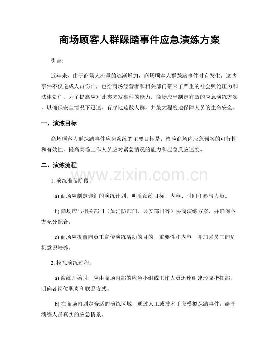 商场顾客人群踩踏事件应急演练的主要目标是:检验商场内应急预案的可行性和有效性,提高商场工作人员应对紧急情况的能力和应急反应速度。