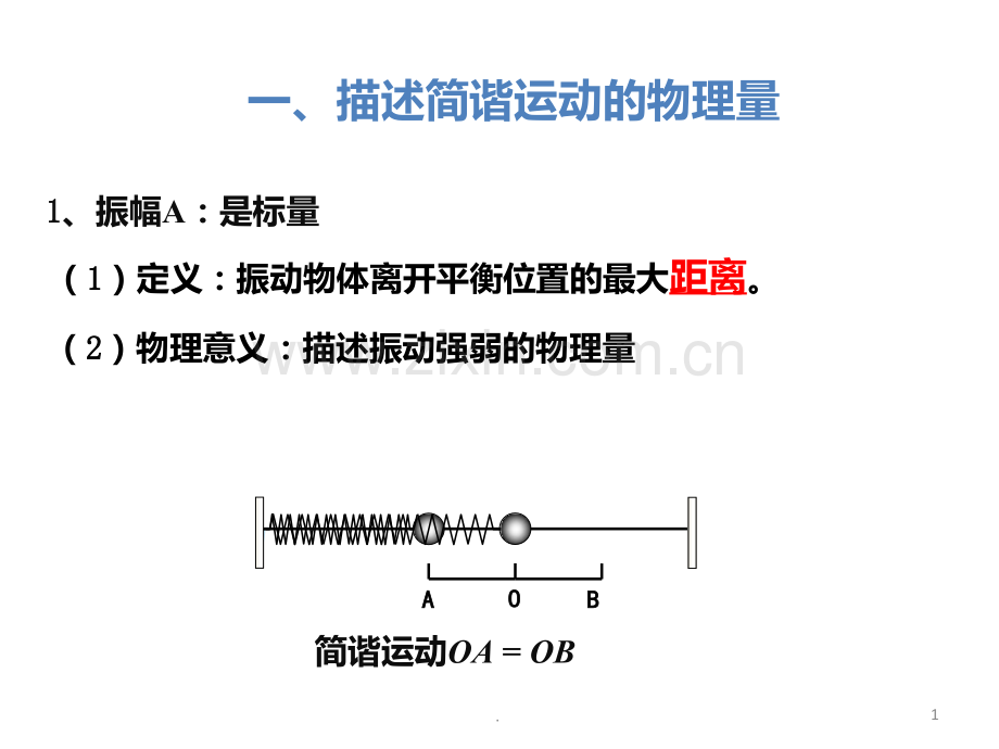 简谐运动OA=OB1 1、振幅A:是标量(1 1)定义:振动物体离开平衡位置的最大距离。(2 2)物理意义:描述振动强弱的物理量O OA AB B一、描述简谐运动的物理量1.问题:若从振子经过C C向右起,经过怎样的运动才叫 完成一次全振动?(2 2)一次全振动:振动物体从某一初始状态开始,再次回到初始状态(即位移、速度均与初态完全相同)所经历的过程。频率f:单位时间内完成全振动的次数2 2、周期和频率:描述振动快慢的物理量(1 1)周期T:振子完成一次全振动所需要的时间O OA AB BC CD D3.提示:半个周期内振子通过的路程等于2个振幅;从平衡位置或从最大位移处开始计时,个周期内振子通过的路程等于一个振幅,从其它位置开始计时,个周期内振子通过的路程可能大于或小于一个振幅。4.5.振幅角速度二、简谐运动的表达式8.9.10.13.15.