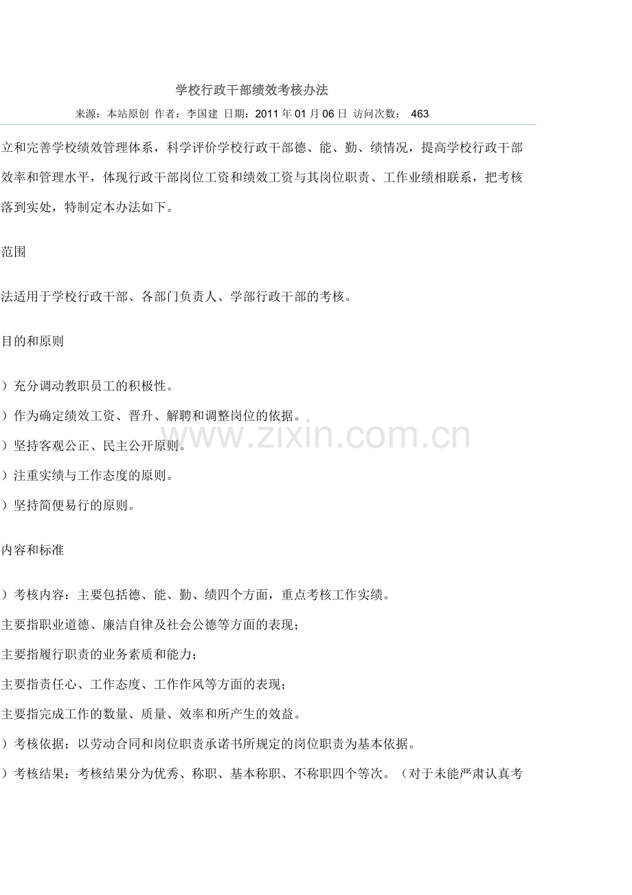 为建立和完善学校绩效管理体系,科学评价学校行政干部德、能、勤、绩情况,提高学校行政干部工作效率和管理水平,体现行政干部岗位工资和绩效工资与其岗位职责、工作业绩相联系,把考核工作落到实处,特制定本办法如下。