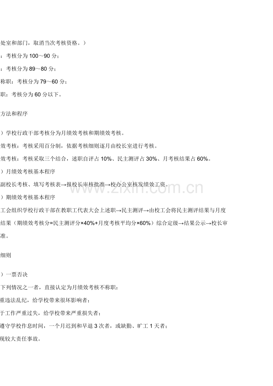 月绩效考核:考核采用百分制,依据考核细则逐月由校长室进行考核。