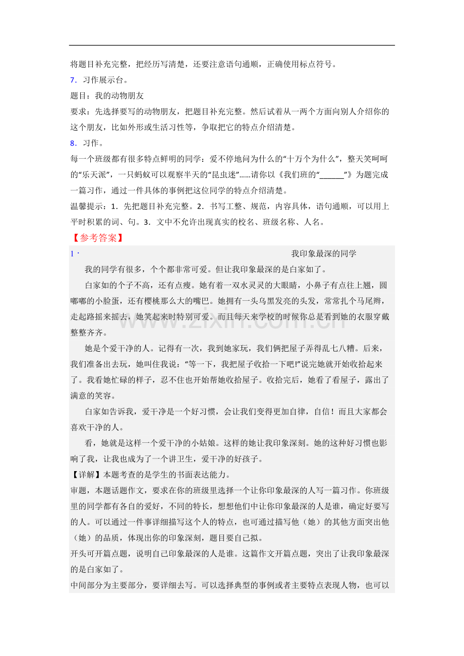 【详解】本题为自命题的叙人作文,要求选择选择生活中具有鲜明特点、给你留下深刻印象的人去写,通过一两件具体的事情来表现他(或她)的特点。向大家介绍介绍他(她)的身材、长相、爱好等。写作时可先介绍人物的外貌、性格等特点,然后选择典型事例表现人物的特点,要抓住重点,不要面面俱到。重点部分要详写,写具体,写详尽,给读者以深刻的印象。这一过程中,一定要把人物的语言、神态、动作、心理活动等写细致,写逼真,这样才能表达出人物的思想品质,才能更好地表达这件事所包含的意义,即文章的中心思想。