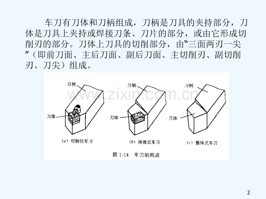 12 刀具与刀具切削过程一、刀具(一)刀具角度1.车刀的组成 刀具是切削加工的主要工具之一,刀具种类繁多,形状各种各样,但就刀具的切削部分而言,均可看作是车刀的演变(图1.5),因此车刀是最基本的切削刀具,在确定刀具的基本定义时,以外圆车刀为基础。a)刨刀 b)钻头 c)铣刀 刨刀、钻头、铣刀的切削部分1 车刀有刀体和刀柄组成,刀柄是刀具的夹持部分,刀体是刀具上夹持或焊接刀条、刀片的部分,或由它形成切削刃的部分。刀体上刀具的切削部分,由“三面两刃一尖”(即前刀面、主后刀面、副后刀面、主切削刃、副切削刃、刀尖)组成。2(1):前刀面(刀具上切屑过的表面)(2):主后刀面(刀具上与工件过渡表面相对的表面)(3):副后刀面(刀具上与工件已加工表面相对的表面)(4):主切削刃(前刀面与主后刀面的交线,主要切削工作)(5):副切削刃(前刀面与副后刀面的交线,参与部分切削工作)(6):刀尖(主切削刃和副切削刃的联接部位,为了增强刀尖的强度,改善散热条件,通常在刀尖处磨出圆弧或直线过渡刃)32.确定刀具角度的静止参考系假设:不考虑进给运动 规定车刀刀尖与工件中心等高 刀柄的中心线垂直于进给方向因此,参考系为静止参考系,主要坐标平面有基面pr、切削平面ps、正交平面(主剖面)po、假定工作平面pf、背平面pp组成。(1)基面(pr):通过主切削刃 选定点,垂直于假定主运动 方向的平面。(2)切削平面(ps):通过 主切削刃选定点,与切削刃 相切并垂直于基面。(3)正交平面(po):通过主 切削刃选定点,并同时垂直 于基面和切削平面 刀具标注角度的参考系4(4)假定工作平面(pf)(进给平面)通过切削刃选定点,与 基 面垂直,且与假定进给方向平行(5)背平面(pp)(切深平面)通过切削刃选定点,同时垂直于基面和假定工作平面53.刀具的标注角度 刀具的标注角度是指刀具在静止参考系中的一组角度,也是刀具制造图上标注的角度,是刀具设计、制造、刃磨和测量所必需的,也称静止角度。主要包括:前角()、背前角()、后角()、背后角()、主偏角()、副偏角()和刃倾角()。6(1)前角()在正交平面内,基面与前刀面之间的夹角。作用:(1)使主切削刃锋利(2)影响切削刃强度 选取原则:工件材料:塑性材料,大前角;脆性,小前角。强度、硬度低,大前角,否则,小前角。刀具材料:高速钢,大前角;硬质合金,小前角。加工性质:精加工,大前角;粗加工,小前角。选取范围:(2)背前角()在背平面内,前刀面与基面之间的夹角。举例:螺纹车刀、插齿刀(3)后角()在正交平面内,切削平面与主后刀面之间的夹角。作用:(1)减少刀具主后刀面与工件之间的摩擦 (2)后刀面的磨损。选取原则:加工性质:精加工,大后角;粗加工,小后角。选取范围:粗加工:精加工:(4)背后角()在背平面内,切削平面与主后刀面之间的夹角。举例:螺纹车刀、插齿刀7大家应该也有点累了,稍作休息大家有疑问的,可以询问和交流大家有疑问的,可以询问和交流大家有疑问的,可以询问和交流大家有疑问的,可以询问和交流8(5)主偏角()基面内,切削平面与假定工作平面间的夹角。作用:(1)影响切屑的形状和刀具寿命 (2)影响背向力 与进给力 的比例 (3)影响表面粗糙度 u对切屑的形状和刀具寿命的影响u主偏角对表面粗糙度大小的影响主偏角小:切屑宽且薄。(散热好,刀具寿命提高)主偏角大:切屑窄且厚。主偏角小:表面粗糙度小。主偏角大:表面粗糙度大。常用角度:45、60、75、909(6)副偏角()基面内,副切削平面与假定工作面间的夹角。作用:(1)影响副切削刃与工件已加工表面的摩擦 (2)影响表面粗糙度的大小 选取范围:副偏角小:表面粗糙度小。副偏角大:表面粗糙度大。10(7)刃倾角()在切削平面内,主切削刃和基面之间的夹角。作用:(1)影响刀头的强度 (2)影响排屑方向 11