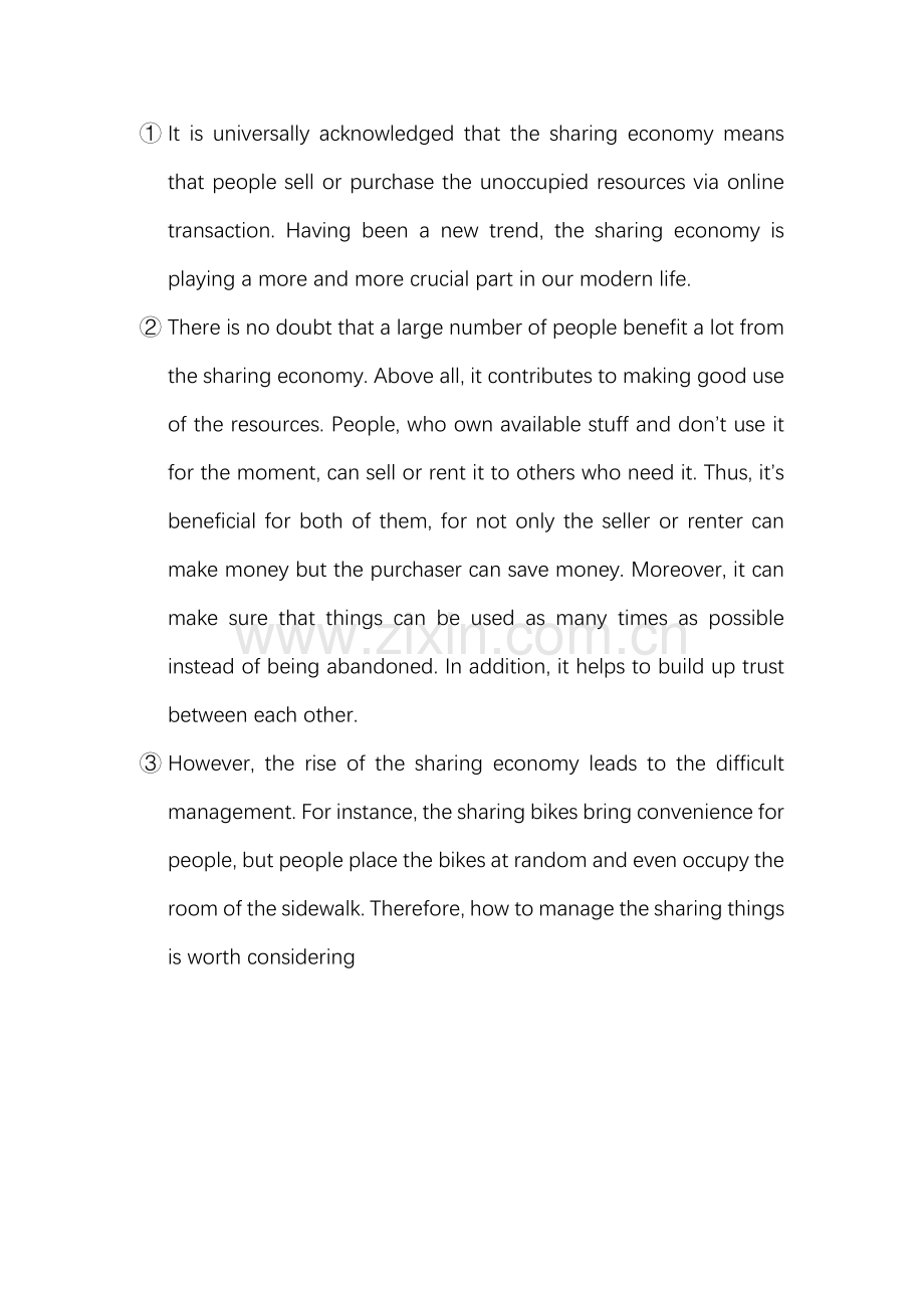 ③ However, the rise of the sharing economy leads to the difficult management. For instance, the sharing bikes bring convenience for people, but people place the bikes at random and even occupy the room of the sidewalk. Therefore, how to manage the sharing things is worth considering