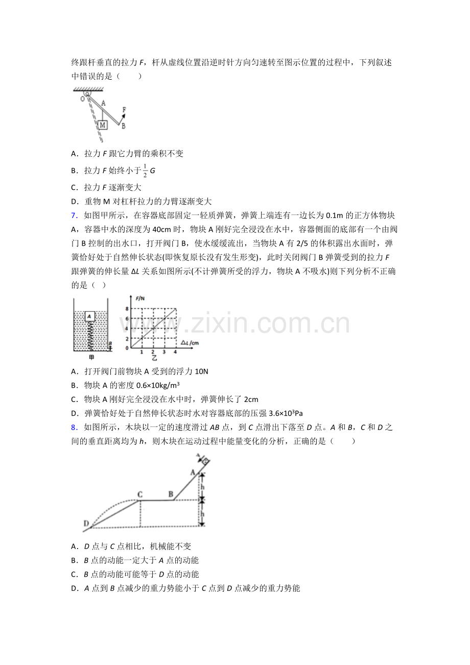 6.如图所示,在轻质杆OB的中点A处,悬挂有重为G的物体M,在端点B施加方向始终跟杆垂直的拉力F,杆从虚线位置沿逆时针方向匀速转至图示位置的过程中,下列叙述中错误的是( )