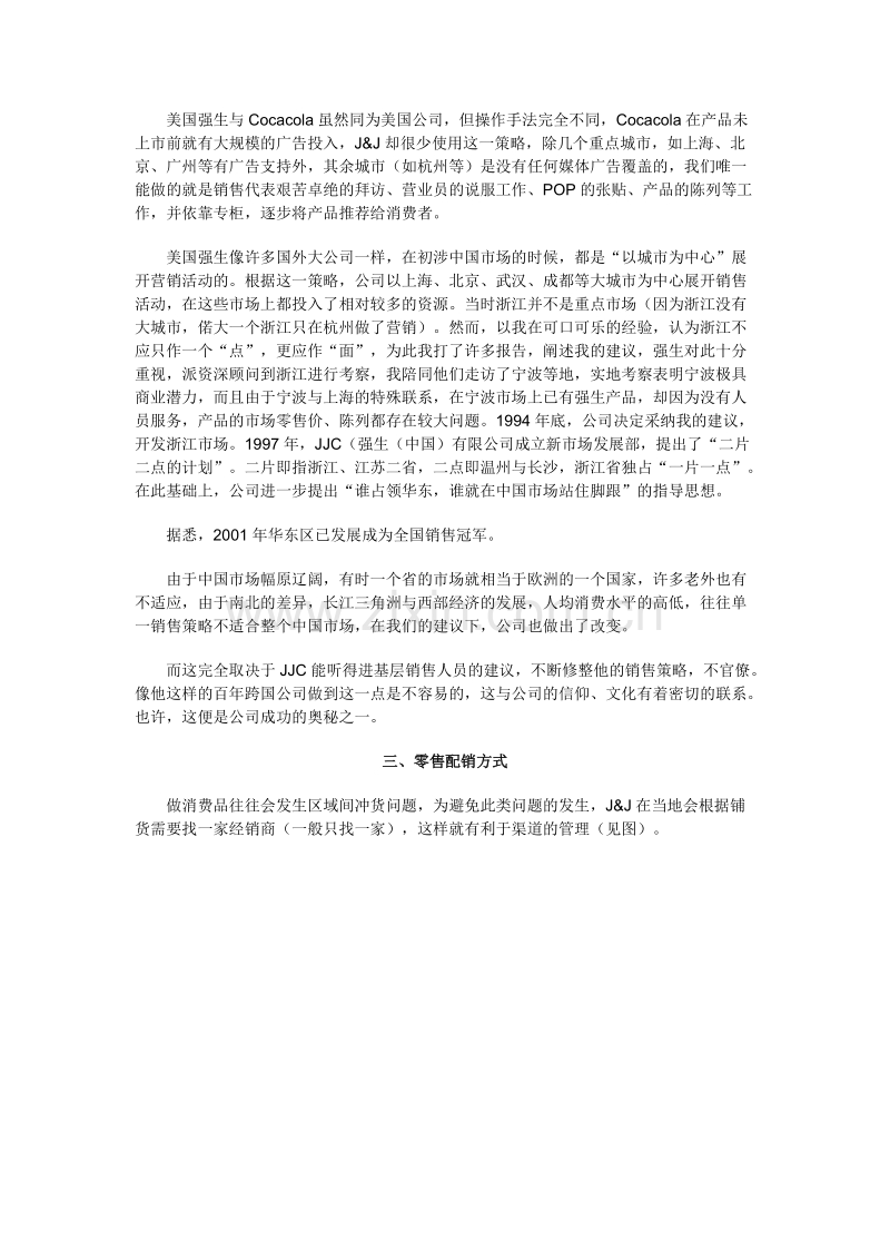J&J通过经销商销售的方式,与Cocacola是不同的。Cocacola全部是直接供货不通过经销商,相比之下,我觉得J&J更胜一筹。J&J将商品给了经销商并不是放手不管,相反,所有活动都是J&J与经销商共同开展的,并针对经销商的操作问题提出自己的经验和建议。因此,市场操作完全是按着J&J的要求进行的。同时,在如此紧密的合作当中,经销商自身也得到了提高。