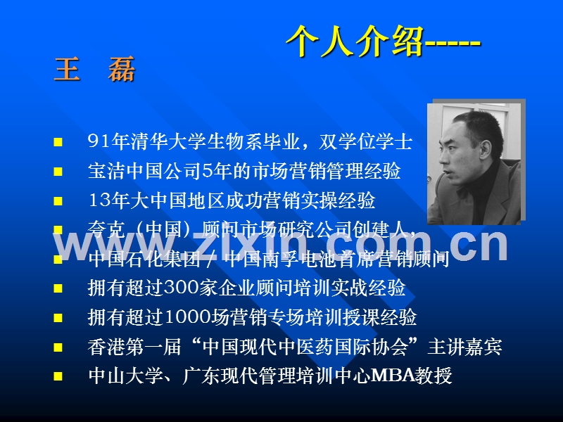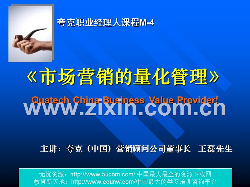 ,主讲:夸克(中国)营销顾问公司董事长王磊先生,《市场营销的量化管理》,夸克职业经理人课程M-4,QuatechChinaBusinessValueProvider!,个人介绍-----,王磊91年清华大学生物系毕业,双学位学士宝洁中国公司5年的市场营销管理经验13年大中国地区成功营销实操经验夸克(中国)顾问市场研究公司创建人,中国石化集团/中国南孚电池首席营销顾问拥有超过300家企业顾问培训实战经验拥有超过1000场营销专场培训授课经验香港第一届“中国现代中医药国际协会”主讲嘉宾中山大学、广东现代管理培训中心MBA教授,学习本课的目的,学习宝洁公司标准化的管理流程借鉴先进、务实的高效管理模式,P&G每年都要进行招聘工作,时间是在每年11月15号开始,共计一个月的时间。参与面试人员超过二百人,来自所有部门。每个被面试者都经过固定程序,一般在最终面试当天就已经决定是否聘用。,营销透视-1,不同于许多公司的是,P&G有一种独特的媒介管理办法。在进入中国的十年内几乎95%的媒介选择电视媒体,平面及报纸广告几乎见不到。大多数公司的高级领导都不直接参与广告的创意制作过程,而P&G的一个广告片审定只需要一个BM(品牌经理)。,营销透视-2,第一章:基本概念与指导思想1-1量化的营销含义1-2量化管理的可行性1-3影响量化管理的因素1-4量化管理的分类第二章:量化的数学基础2-1基础统计学原理2-2风险管理模型2-3量化管理模型2-4量化管理模型分类,第四章:市场营销的量化管理4-1营销量化的管理4-2需求与产品概念4-3产品开发量化管理4-4市场诊断与机会评估4-5广告与促销第五章:量化管理的问题与解决5-1数据与信息成本5-2培训与标准化5-3组织架构与量化管理,目录,第三章:量化管理的基本步骤3-1问题的界定3-2评估问题的标准3-3模型的建立3-4数据标准化3-5数据采集方法3-6环境因素的调整3-7无法获得信息的处理,第一章基本概念与指导思想,1-1量化的营销含义,营销是一系列的决策所组成的决策决定了营销的结果量化每一个决策步骤,将会大大降低结果的不可预知性,降低风险。量化的决策系统(DSS)可以保证成功量化的决策是企业正规化管理的基础,1-2中国企业量化管理的可行性,正面因素:1、大资本的形成2、营销潮流3、失败的反思4、管理的要求负面因素:1、过去的经验与习惯2、个人英雄主义3、投机心理4、管理者个性与理念5、专业营销人员的缺乏,1-3影响量化管理的因素,中国的模糊主义文化,过渡性理论,粗旷的管理模式,企业的经营发展理念,领导者的知识,执行的水平,资源整合,,1-4量化管理的分类,结果量化过程量化管理量化,第二章量化的数学基础,2-1基础统计学原理,,2-1-1事物的发展规律,正态分布随机性个体与整体概率,2-1-2对统计数字的理解,相对性概率性表达方式,2-1-3基本概念,平均值中值置信度误差,2-1-4统计分析、工具,相关回归聚类,2-2风险管理模型,,,风险,投入,,量化管理关键点,,,2-3量化管理模型,外部因素,决策模型,环境因素,决策因素,量化目标,,,,,2-4量化管理模型分类,个案量化局限性模型通用模型,第三章量化管理的基本步骤,量化管理的基本步骤,1、问题的界定,2、评估问题的标准,3、模型的建立,4、数据标准化,5、数据采集方法,6、环境因素的调整,7、无法获得信息的处理,3-1-1问题的界定,问题=决策方法问题的概括与抽象化问题的具体化,洗发水的香味面试与招聘激励机制,3-1-2案例,,宝洁招聘介绍,步骤:1、三大类因素的确定2、筛选核心因素3、确定变量4、制作变量关系图,3-2-1确定评估问题的标准,3-2-2案例--利润变量关系图,利润,营销成本,生产成本,销售费用,固定成本,设备,其它,原材料,人工,回款,生产量,需求量,工时,产品市场价格,剩余生产量,需求,材料价,工作效率,定员,,,,,,,,,,,,,,,,,,,,,,,,,,,,模型:将复杂的自然现象抽象与简化生成的由核心因素及简单逻辑所组成的一个简化表现。模型的好处:节省时间与精力易于理解与操作如有需要,便于修改模型的分类:简单模型复杂模型动态模型,3-3-1模型的建立,3-3-2例:P&G的模型,,,,,,P&G模型,简单,货架管理,复杂,广告片评估,动态,CPS上市管理模型,3-3-3建立模型的工具,统计学工具行为学工具数据库电脑软件,3-4数据标准化与指标,数据标准化是最为操作性的工作需要大量数学及行为学知识抽象与简化标准化过程应本着实用性和相对性的原则,3-5数据采集,采集表格设计采集方式误差估计质量监控制度配合市场调研基础介绍,,3-6环境因素的调整,量化管理模型需要一定的组织及物质基础,有时需要为它创造环境。制度环境组织环境成本环境其它环境例:P&G的招聘系统介绍,3-8无法采集信息的处理,例:P&G的概念测试与销售预测,,,,,,简单,复杂,动态,变量不确定处理,决策树,模拟,模拟/相关性,第四章市场营销的量化管理,4-1营销量化的基础,不同于财务与生产的量化过程,营销过程的量化管理涉及较多的过程及行为学的理论。量化中需要对事物及行为的双重量化并有机结合。营销量化的工具:1、统计学2、行为学3、软件4、硬件5、营销实验6、数据库,4-1-1通用的营销过程,企业,网络,媒体,客户,研究公司,信息,,,,,,,,,,,,,,1,2,3,4,产品,信息,资金,8,产品,5,6,7,4-1-2营销过程中的关键点,1、需求与产品2、广告与概念3、网络4、媒介5、市场评估与预测6、销售7、促销8、信息反馈,4-1-3消费行为学,在营销的关键点中涉及的每一个方面都牵涉了人类行为