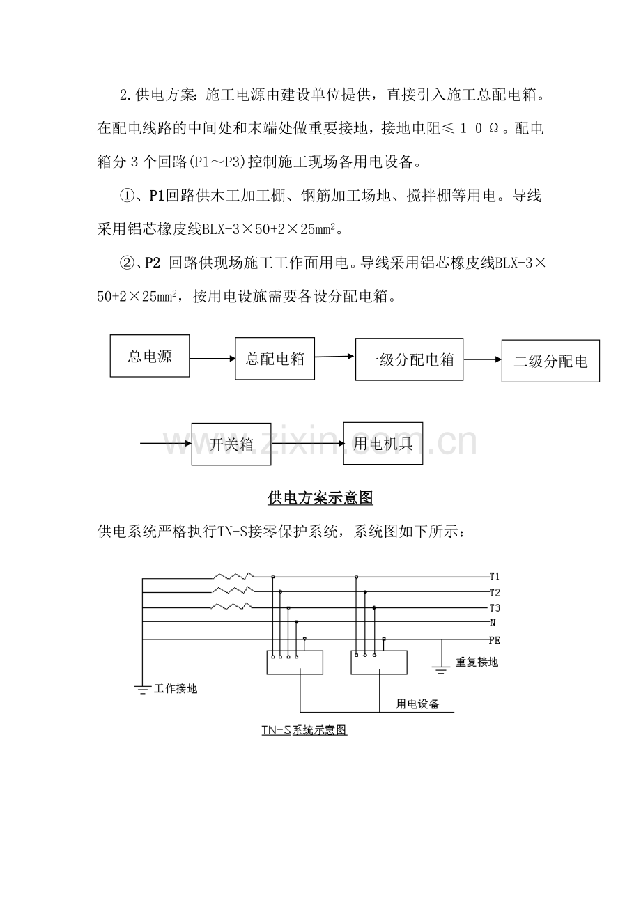 1.现场临时用电设施:现场临时供电按《工业与民用供电系统设计规范》和《施工现场临时用电安全技术规范》设计并组织施工,供配电采用TN—S接零保护系统,按三级配电两级保护设计施工,PE线与N线严格分开使用。接地电阻不大于4Ω,施工现场所有防雷装置冲击接地电阻不大于30Ω。开关箱内漏电保护器额定漏电动作电流不大于30mA,额定漏电动作时间不大于0.1s。
