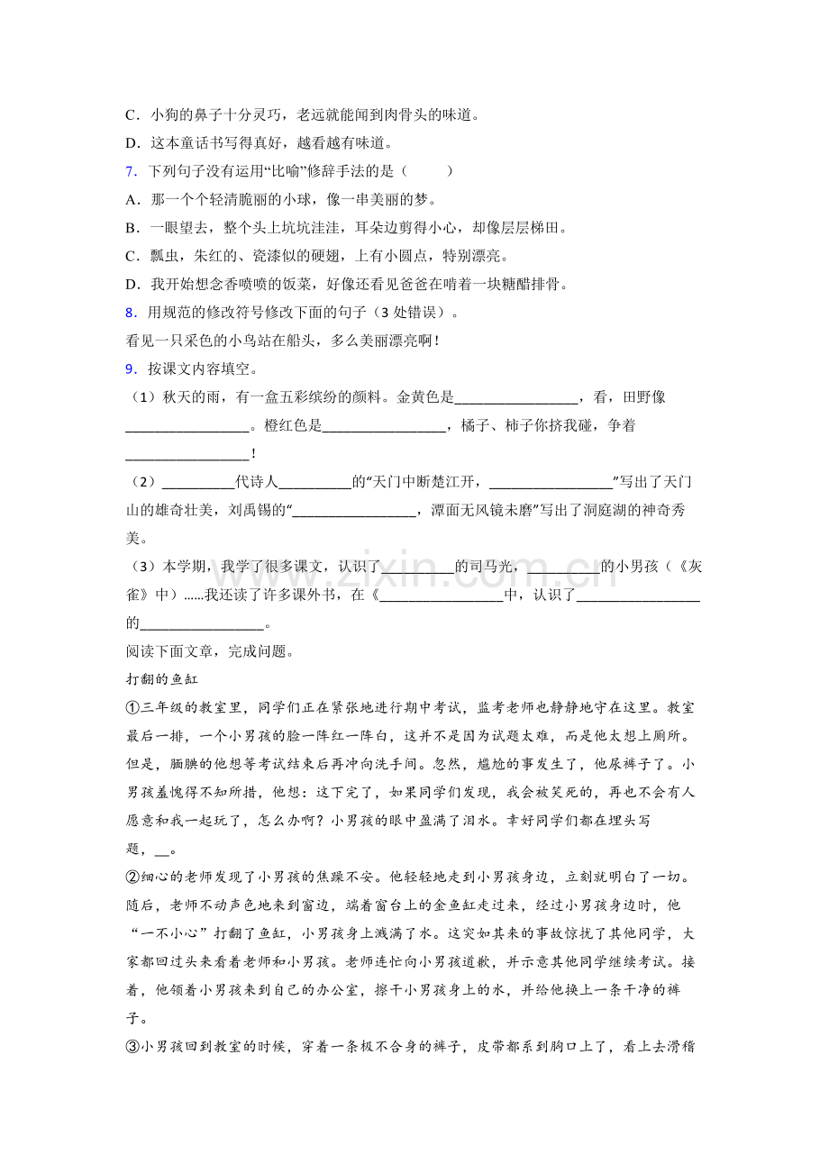 【解析】10、B A 122.: “ 。 ” “ 。 ” , 。 123.C 124. 1 3 2 125.你看,老师巧妙地利用了打翻鱼缸这件事情,来掩饰小男孩的尴尬事,这是多么聪明,多么富有爱心的老师啊!