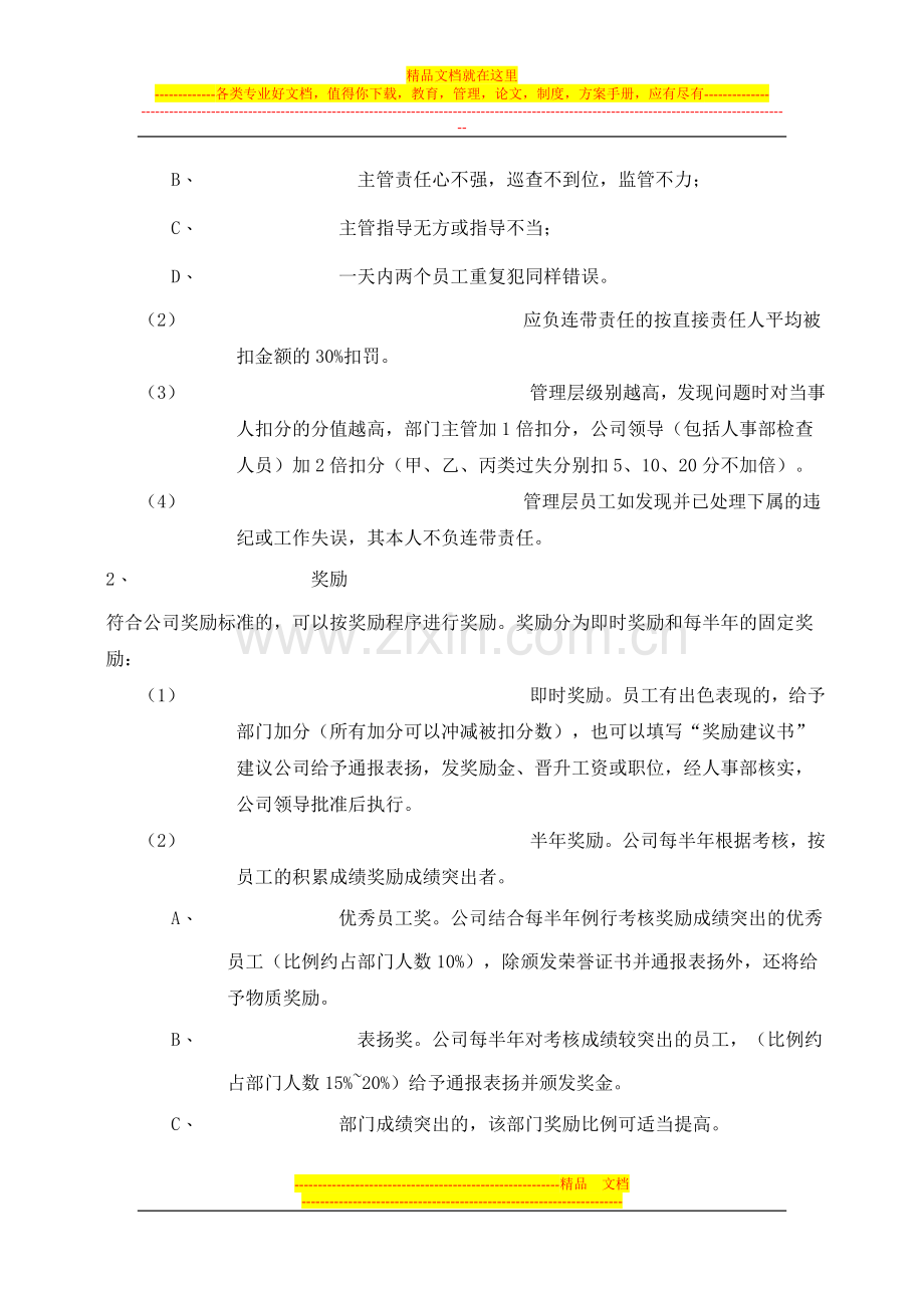 (3) 管理层级别越高,发现问题时对当事人扣分的分值越高,部门主管加1倍扣分,公司领导(包括人事部检查人员)加2倍扣分(甲、乙、丙类过失分别扣5、10、20分不加倍)。