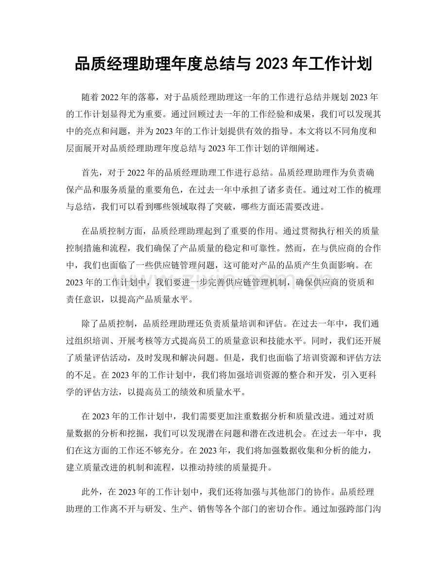 综上所述,品质经理助理年度总结与2023年工作计划是一个重要的工作,通过全面回顾过去一年的工作经验和成果,我们可以发现问题并制定解决方案,为新的一年定下明确的目标和方向。只有通过不断地反思和提升,我们才能够逐步提高品质经理助理的工作质量和水平,为企业的可持续发展贡献力量。