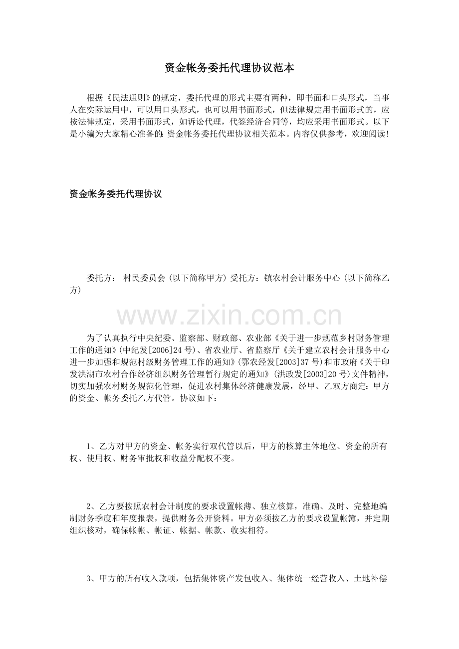 资金帐务委托代理协议范本