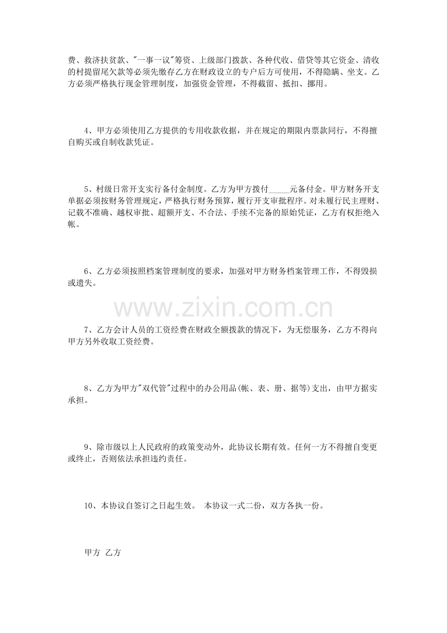 7、乙方会计人员的工资经费在财政全额拨款的情况下,为无偿服务,乙方不得向甲方另外收取工资经费。
