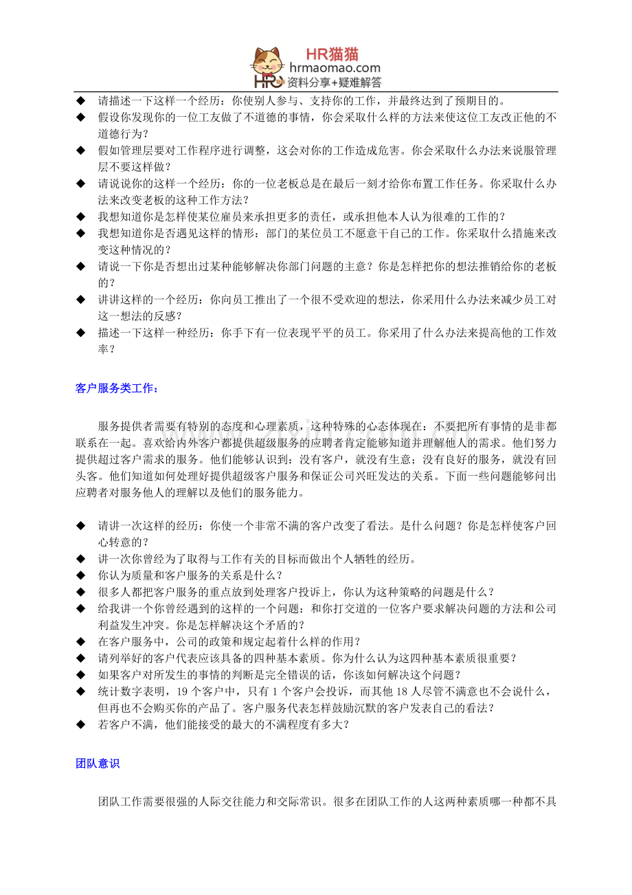 不论什么工作,沟通都是很重要的一部分。其实,工作责任越大,对这个职位上员工的沟通能力的要求就越高。面试是考核人的沟通能力的很好的办法。面试中,你有机会了解应聘者表达的思想是否具有说服力,概念描述得是否清楚,思路是否有条理,用词是否准确,是否能吸引听者的注意力,以及应聘者是否能保持与对方的视线,等等。你需要一位清楚准确并能和公司各个层次的人沟通的人。下面一些问题主要用来测试应聘者的沟通技能。