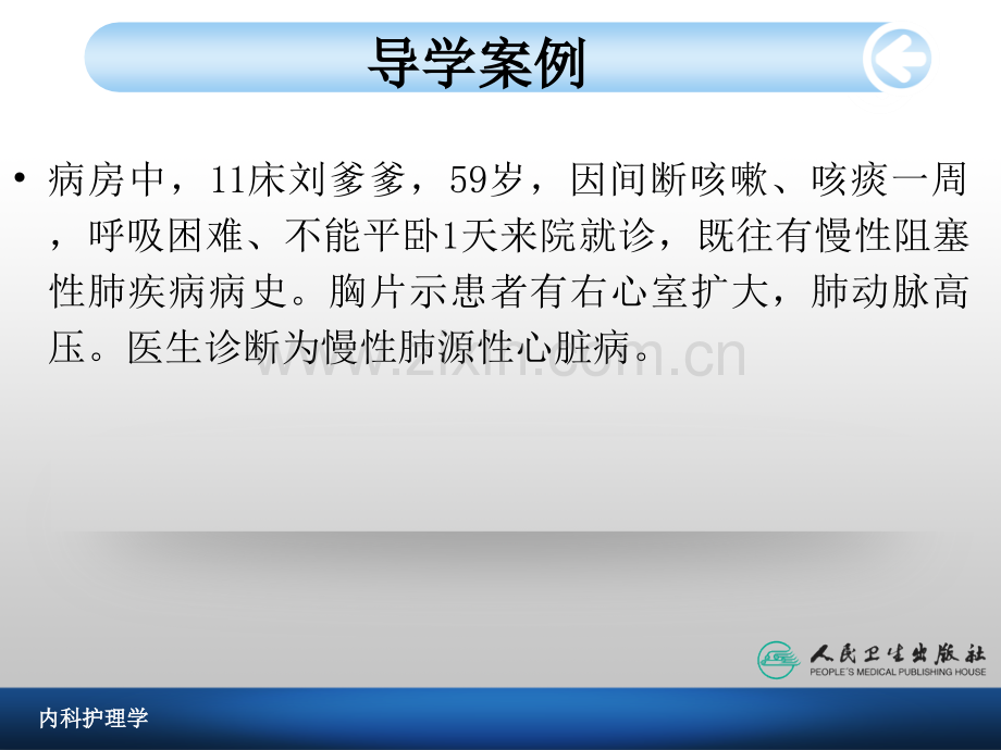 呼吸系统疾病病人的护理呼吸系统疾病病人的护理 湖北省高职高专护理类专业规划教材湖北省高职高专护理类专业规划教材徐财神徐财神-内科护理学内科护理学 慢性肺源性心脏病慢性肺源性心脏病病人病人的护理的护理内科护理学内科护理学病房中,11床刘爹爹,59岁,因间断咳嗽、咳痰一周,呼吸困难、不能平卧1天来院就诊,既往有慢性阻塞性肺疾病病史。胸片示患者有右心室扩大,肺动脉高压。医生诊断为慢性肺源性心脏病。导学案例导学案例内科护理学内科护理学 请思考:请思考:你作为患者的管床护士,你怎么进行健康教育?内科护理学内科护理学病因病因慢性肺源性心脏病简称慢性肺心病,指由于肺组织、肺血管或胸廓的慢性病变引起肺组织结构和(或)功能异常,产生肺血管阻力增加,肺动脉压力增高,使右心室扩张和(或)肥厚,伴或不伴右心功能衰竭的心脏病,并排除先天性心脏病和左心病变引起者。内科护理学内科护理学按原发病的部位不同,分为三类:按原发病的部位不同,分为三类:(1)支气管、肺疾病:最多见为慢性阻塞性肺疾病,约占80%-90%,其次为支气管哮喘、支气管扩张、重症肺结核、肺尘埃沉着症、间质性肺炎等。内科护理学内科护理学按原发病的部位不同,分为三类:按原发病的部位不同,分为三类:(2)胸廓运动障碍性疾病:较少见,严重脊椎侧后凸、脊椎结核、类风湿关节炎、胸膜广泛粘连及胸廓成形术后造成的严重胸廓或脊椎畸形,以及神经肌肉疾患如脊髓灰质炎等,均可引起胸廓活动受限、肺受压、支气管扭曲或变形,导致肺功能受损。气道引流不畅,肺部反复感染,并发肺气肿或纤维化。内科护理学内科护理学(3)肺血管疾病:慢性血栓栓塞性肺动脉高压、肺小动脉炎、原发性肺动脉高压等引起肺血管阻力增加、肺动脉高压和右心室负荷加重,发展为慢性肺心病。(4)其他:原发性肺泡通气不足及先天性口咽畸形、睡眠呼吸暂停低通气综合征等均可产生低氧血症,引起肺血管收缩,导致肺动脉高压,发展成慢性肺心病内科护理学内科护理学发病机制发病机制引起右心室扩大、肥厚的因素很多。肺功能和结构的不可逆改变时先决条件,发生反复的气道感染和低氧血症,导致一系列体液因子和肺血管的变化,使肺血管阻力增加,肺动脉血管的结构重塑,产生肺动脉高压内科护理学内科护理学(1)肺动脉高压的形成1)肺血管阻力增高的功能性因素:缺氧、二氧化碳潴留和呼吸性酸中毒导致肺血管收缩、痉挛。内科护理学内科护理学 2)肺血管阻力增加的解剖学因素:各种慢性胸肺疾病可导致肺血管解剖结构的变化,形成肺循环血流动力学障碍。主要原因有:肺血管炎症:管腔狭窄或闭塞肺血管重塑.血栓形成.内科护理学内科护理学 3)血容量增多和血液黏稠度增加:慢性缺氧产生继发性红细胞增多,血液黏稠度增加,血流阻力随之增高。另一方面,缺氧可使醛固酮分泌增加,并使肾小动脉收缩,肾血流量减少,导致水钠潴留,血容量增多。血液黏稠度增加和血容量增多,可使肺动脉压进一步升高内科护理学内科护理学(2)右心功能的改变:肺循环阻力增加时,右心发挥代偿作用,在克服肺动脉压升高的阻力时发生右心室肥厚。随着病情发展,肺动脉压持续升高,右心失代偿而致右心衰竭。(3)其他重要器官的损害:缺氧和高碳酸血症可导致重要器官如脑、肝、肾、胃肠及内分泌系统、血液系统的病理改变,引起多器官的功能损害。内科护理学内科护理学护理评估护理评估护理评估护理评估健康史健康史健康史健康史询问病人有无吸烟史,询问病人有无吸烟史,有无咳嗽、咳痰、气促等,活动后有无心悸、呼有无咳嗽、咳痰、气促等,活动后有无心悸、呼吸困难;吸困难;有无乏力和活动耐力下降。有无乏力和活动耐力下降。急性发作与季节交替或气温骤降有关。急性发作与季节交替或气温骤降有关。内科护理学内科护理学护理评估护理评估护理评估护理评估健康史健康史健康史健康史是否进行过胸部是否进行过胸部X X光片或胸部光片或胸部CTCT检查;检查;心电图是否正常等。心电图是否正常等。是否进行长期规律的治疗,是否进行长期规律的治疗,是否知道如何预防急性发作的方法。是否知道如何预防急性发作的方法。内科护理学内科护理学护理评估护理评估护理评估护理评估身体状况身体状况身体状况身体状况本病发展缓慢,临床上除原有肺、胸疾病的各种本病发展缓慢,临床上除原有肺、胸疾病的各种症状和体征外,主要是逐步出现肺、心功能衰竭症状和体征外,主要是逐步出现肺、心功能衰竭以及其他器官损害的表现。按其功能的代偿期与以及其他器官损害的表现。按其功能的代偿期与失代偿期进行分述。失代偿期进行分述。内科护理学内科护理学(1 1)肺、心功能代偿期)肺、心功能代偿期1 1)症状:咳嗽、咳痰、气促,活动后可有心悸、)症状:咳嗽、咳痰、气促,活动后可有心悸、呼吸困难、乏力和活动耐力下降。急性感染可加呼吸困难、乏力和活动耐力下降。急性感染可加重上述症状。重上述症状。2 2)体征:可有不同程度的发绀和肺气肿体征,偶)体征:可有不同程度的发绀和肺气肿体征,偶有干、湿性啰音,心音遥远。有右心室肥厚的体有干、湿性啰音,心音遥远。有右心室肥厚的体征,部分病人可有颈静脉充盈。征,部分病人可有颈静脉充盈。内科护理学内