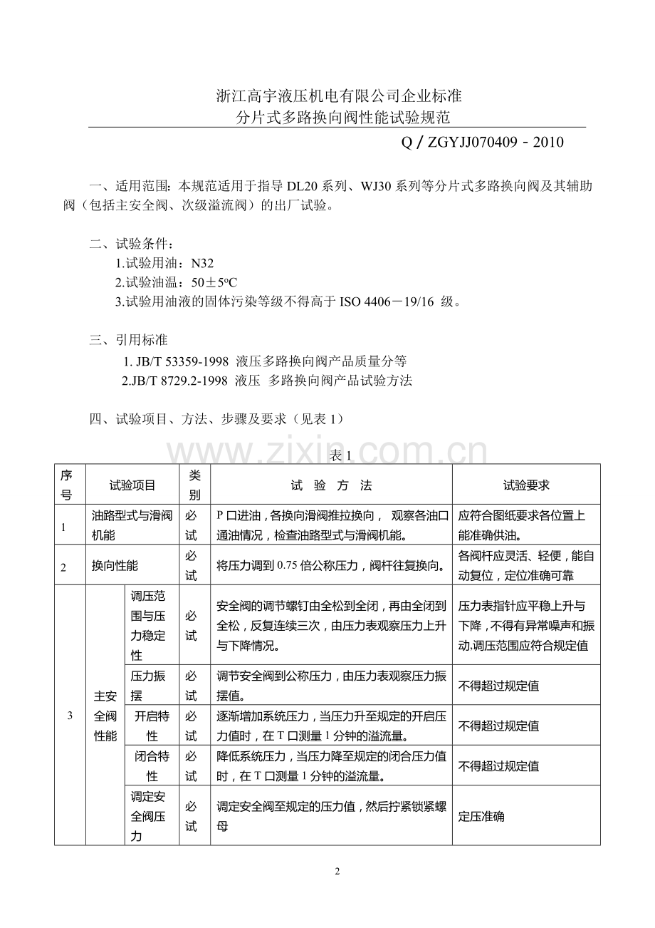 一、适用范围:本规范适用于指导DL20系列、WJ30系列等分片式多路换向阀及其辅助阀(包括主安全阀、次级溢流阀)的出厂试验。