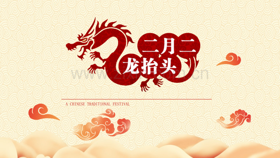 A CHINESE TRADITIONAL FESTIVAL壹节日起源贰节日习俗叁民间传说肆祝福问候目录节日起源壹 节日起源 龙抬头龙抬头是每年农历二月初二,俗称春龙节、龙头节,传说是龙抬头的日子,它是中国的一个传统节日。庆祝“龙头节”,以示敬龙祈雨,让老天爷保佑丰收。二月初二前后,春回大地,人们期望龙出镇住一切有害的毒虫,期望着丰收。这就是“二月二,龙抬头”的说法。民间传说二月二节日习俗贰点击输入内容点击点击输入内容点击点击输入内容点击剪龙头二月初二理发,儿童理发,叫剃“喜头”,借龙抬头之吉时,保佑孩童健康成长;大人理发,辞旧迎新,希望带来好运,新的一年顺顺利利。节日起源 节日习俗 炒糖豆二月二熏香,从院子各处一直点到室内,有缝就插,这一天被称为熏虫日。因为大部分虫子从这天开始动弹了,这些粮食虫、蛀虫均属害虫,人们认为这一熏,一年家中屋里不遭害虫。二月二熏香民间传说叁点击输入内容点击点击输入内容点击点击输入内容点击 民间传说谚“二月二,龙抬头”,传说古时候关中地区久旱不雨,玉皇大帝命令东海小龙前去播雨。小龙贪玩,一头钻进河里不再出来。有个小伙子,到悬崖上采来了“降龙水”,搅浑河水。小龙从河中露出头来与小伙子较量,小龙被击败,只好播雨。其实,所谓“龙抬头”指的是经过冬眠,百虫开始苏醒。所以俗话说“二月二,龙抬头,蝎子、蜈蚣都露头。”“二月二”还有一种说法叫春龙节。许慎的说文解字记载:“龙,鳞中之长,能幽能明、能细能巨,能长能短,春分登天,秋分而潜渊。”这大概就是“春龙节”习俗的最早记载。相传,武则天当了皇帝,玉帝便下令三年内不准向人间降雨。但司掌天河的玉龙不忍百姓受灾挨饿,偷偷降了一场大雨,玉帝得知后,将司掌天河的玉龙打下天宫,压在一座大山的下面。山下还立了一块碑,上面写道:龙王降雨犯天规,当受人间千秋罪。要想重登灵霄阁,除非金豆开花时。民间传说春龙节人们为了拯救龙王,到处寻找开花的金豆。到了第二年二月初二这一天,人们正在翻晒金黄的玉米种子,猛然想起,这玉米就象金豆,炒开了花,不就是金豆开花吗?于是家家户户爆玉米花,并在院里设案焚香,供上“开花的金豆”,专让龙王和玉帝看见。龙王知道这是百姓在救它,就大声向玉帝喊到:“金豆开花了,放我出去!”玉帝一看人间家家户户院里金豆花开放,只好传谕,诏龙王回到天庭,继续给人间兴云布雨。从此以后,民间形成了习惯,每到二月二这一天,人们就爆玉米花,也有炒豆的。大人小孩还念着:“二月二,龙抬头,大仓满,小仓流。”有的地方在院子里用灶灰撒成一个个大圆圈,将五谷杂粮放于中间,称作“打囤”或“填仓”。其意是预祝当年五谷丰登,仓囤盈满。民间传说春龙节