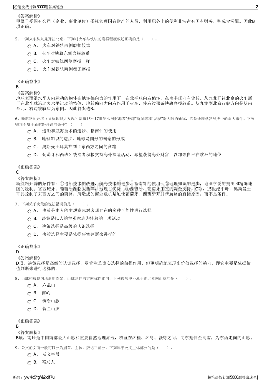 粉笔决战行测5000题答案速查一、第一部分 常识判断 (根据题目要求,在四个选项中选出一个最恰当的答案。)1、红绿色盲是一种常见的遗传性疾病。在生活中,男性患者的人数远远多于女性患者,造成这一差异的主要原因是()。 A 控制红绿色盲的基因位于X染色体上,如果一条X染色体上携带致病基因,而另一条染色体的相应位置上携带正常的基因,个体并不会发病。而Y染色体上没有相应基因。 B 控制红绿色盲的基因位于Y染色体上,随Y染色体进行传递 C 控制红绿色盲的基因位于X染色体上,由于男性缺乏一种女性独有的激素,在发育过程中容易受到多种诱因的影响而发病 D 男女两性的实际患病率是相同的,只是由于两性在日常生活中偏重的领域有所不同,男性患者容易被辨认而女性患者不容易被辨认。正确答案A答案解析控制性别的染色体中XX结合是女性,XY结合是男性,控制红绿色盲的基因是隐性,女性必须两条X染色体都携带致病基因才会是红绿色盲,而男性只有一条X染色体,只要携带致病基因,就是红绿色盲,即男性患者比女性患者多。因此A项正确。2、关于太阳大气层的叙述,正确的是()。 A 色球层厚度最厚 B 可见光来源于太阳大气层的最外层 C 我们平时用肉眼观察到的太阳表层是光球层 D 黑子出现在色球层,耀斑出现在光球层上正确答案C答案解析A项错误,厚度最厚的应是日冕层。B项错误,可见光来源于太阳大气层的最内层,即光球层。D项错误,黑子出现在光球层,耀斑出现在色球层上。3、根据我国宪法规定,下列可以提出修改宪法有效议案的主体是()。 A 全国人民代表大会常务委员会 B 全国人民代表大会的一个代表团 C 1/10以上的全国人民代表大会代表 D 全国人民代表大会主席团正确答案A答案解析中华人民共和国宪法第六十四条规定,宪法的修改,由全国人民代表大会常务委员会或者五分之一以上的全国人民代表大会代表提议,并由全国人民代表大会以全体代表的三分之二以上的多数通过。因此答案选A。4、某国有单位会计甲到银行提取本单位工资,由于银行出纳疏忽大意,多支付给甲3000元,甲回单位后发现多余款额,遂据为己有,甲的行为构成()。 A 诈骗罪 B 贪污罪 C 盗窃罪 D 不构成犯罪正确答案B粉笔决战行测5000题答案速查1编码:yw4x5g*&2loif7u粉笔决战行测5000题答案速查答案解析甲属于受国有公司(企业、事业单位)委托管理国有财产的人员,利用职务上的便利非法占有国有财务,购成贪污罪。因此B项正确。5、一列火车从九龙开往北京,下列对火车与铁轨的磨损程度叙述正确的是()。 A 火车对铁轨西侧磨损较重 B 火车对铁轨东侧磨损较重 C 火车对铁轨两侧磨损一样 D 火车对铁轨两侧都无磨损正确答案B答案解析地球表面沿水平方向运动的物体在地转偏向力的作用下,在北半球向右偏转,在南半球向左偏转。从九龙开往北京的火车属于在北半球沿地表水平运动的物体,地转偏向力向右作用于火车,使右边那条铁轨磨损较重。从九龙到北京行驶方向是从南至北,右边铁轨应为东侧。因此答案选B。6、新航路的开辟(又称地理大发现)是指1517世纪欧洲航海者“开辟”新航路和“发现”新大陆的通称,它是地理学发展史中的重大事件。下列哪项不属于新航路开辟的条件?() A 造船和航海技术的进步、指南针的使用 B 地理知识的进步,地球是圆形的概念的形成 C 奥斯曼土耳其控制了东西方之间的商路 D 葡萄牙和西班牙统治者积极支持海外探险活动,希望获得海外财富,以加强自己在欧洲的地位正确答案C答案解析新航路开辟的条件有:造船技术的改进,航海技术的进步、指南针的使用;地理知识的进步,地圆学说的提出和精确地图的绘制;西班牙、葡萄牙濒临大西洋,地理占优势;西班牙、葡萄牙王室的资金支持。C项,15世纪中叶,奥斯曼土耳其控制了东西方之间的商路,所造成的商业危机是迫使葡萄牙、西班牙开辟新航路的直接原因,而不是条件。7、下列关于决策的说法错误的是()。 A 决策是由人的主观意志对客观存在的多种可能性进行选择 B 决策是以人的主观意志为转移的一项活动 C 决策选择是高级的认识选择 D 决策选择主要是依据事实判断来进行的正确答案D答案解析D项,决策选择是高级的认识选择,尽管注重事实选择的前提作用,但更明确地表现出价值选择的趋向,即它主要是依据价值判断来进行选择的。8、山脉构成我国地形的骨架,山脉延伸的方向称作走向,下列选项中不属于南北走向山脉的是()。 A 六盘山 B 南岭 C 横断山脉 D 贺兰山脉正确答案B答案解析B项,南岭是中国南部最大山脉和重要自然地理界线,横亘在湘桂、湘粤、赣粤之间,向东延伸至闽南,为东西走向的山脉。9、公文的文面一般可以分为眉首、主体、版记三部分,下列属于公文主体部分的是()。 A 发文字号 B 签发人粉笔决战行测5000题答案速查2编码:yw4x5g*&2loif7u粉笔决战行测5000题答案速查 C 抄送机关 D 附注正确答案D答案解析D项正确,党政机关公文处理工作条例第九条规定,公文一般由份号、密级和保密期限、紧急程度、发文机关标志、发文字号、签发人、标题、主送机关、正文、附件说明、发文机关署名、成文日期、印章、附注、附件、抄送机关、印发机关和印发日期、页码等组成。故附注属于公文的主体部分。10、下列有关生活常识的说法,错误的一项是()。 A 含氮、磷化合物的生活污水大量