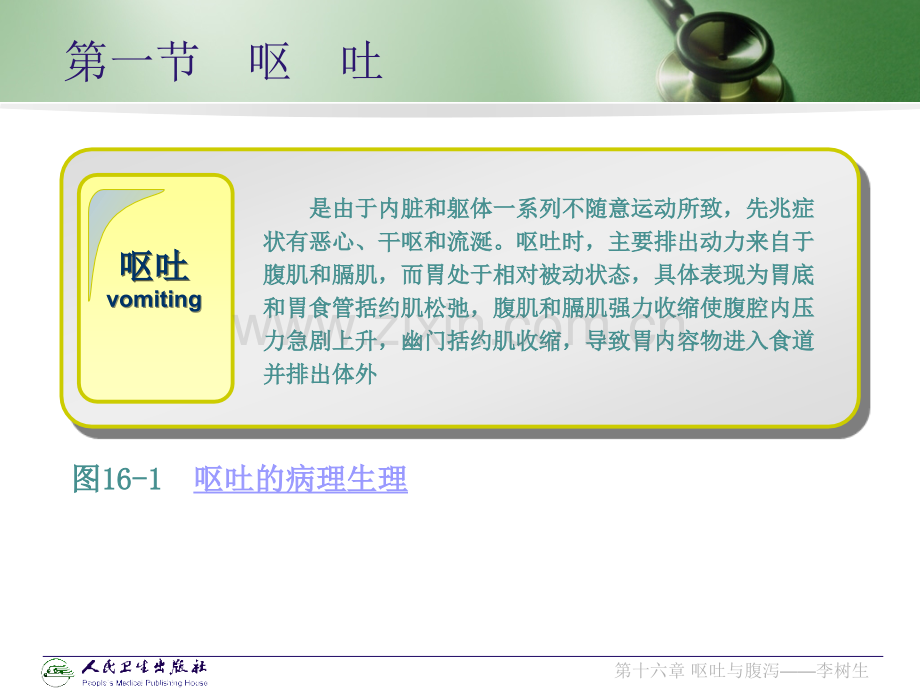 第十六章 呕吐与腹泻急诊医学急诊医学第十六章 呕吐与腹泻李树生第一节 呕 吐 图图16-1 16-1 呕吐的病理生理呕吐的病理生理呕吐呕吐呕吐呕吐vomitingvomiting是由于内脏和躯体一系列不随意运动所致,先兆症是由于内脏和躯体一系列不随意运动所致,先兆症状有恶心、干呕和流涎。呕吐时,主要排出动力来自于状有恶心、干呕和流涎。呕吐时,主要排出动力来自于腹肌和膈肌,而胃处于相对被动状态,具体表现为胃底腹肌和膈肌,而胃处于相对被动状态,具体表现为胃底和胃食管括约肌松弛,腹肌和膈肌强力收缩使腹腔内压和胃食管括约肌松弛,腹肌和膈肌强力收缩使腹腔内压力急剧上升,幽门括约肌收缩,导致胃内容物进入食道力急剧上升,幽门括约肌收缩,导致胃内容物进入食道并排出体外并排出体外第十六章 呕吐与腹泻李树生呕吐的病因 呕吐原因危重症急症非急症胃胃肠肠道道自自发发性食管破裂性食管破裂综综合征合征(Boerhaaves syndrome)肠肠缺血缺血胃出口梗阻、胰腺炎胃出口梗阻、胰腺炎胆囊炎、胆囊炎、肠肠梗阻梗阻内内脏脏穿孔、穿孔、阑阑尾炎尾炎腹膜炎腹膜炎胃炎胃炎、胃胃轻瘫轻瘫、消化性消化性溃疡溃疡胃胃肠肠炎炎、胆胆绞绞痛、肝炎痛、肝炎神神经经系系统统颅颅内出血内出血脑脑膜炎膜炎偏偏头头痛、痛、颅颅内内压压增加增加神神经经系系统肿统肿瘤瘤内分泌系内分泌系统统糖尿病糖尿病酮酮症酸中毒症酸中毒肾肾上腺功能不全上腺功能不全甲状腺甲状腺妊娠妊娠妊娠妊娠剧剧吐吐妊娠呕吐妊娠呕吐药药物中毒物中毒对对乙乙酰酰氨基酚、地高辛氨基酚、地高辛阿司匹林、茶碱阿司匹林、茶碱治治疗疗用用药药阿司匹林阿司匹林红红霉素、布洛芬霉素、布洛芬化化疗药疗药药药物成物成瘾瘾酒精、麻醉酒精、麻醉剂剂 麻醉麻醉剂剂撤撤药药泌尿生殖系泌尿生殖系统统性腺扭性腺扭转转尿路感染、尿路感染、肾结肾结石石其他其他心肌梗死心肌梗死脓脓毒症毒症一氧化碳中毒一氧化碳中毒电电解解质质紊乱紊乱晕动晕动病病迷路炎迷路炎第十六章 呕吐与腹泻李树生Mallory-WeissMallory-Weiss撕裂撕裂(食管贲门线形撕裂)(食管贲门线形撕裂)低血容量低血容量 BoerhaaveBoerhaave综合征综合征(食管破裂)(食管破裂)误吸误吸 代谢性碱中毒代谢性碱中毒 低血钾低血钾 临床临床特点特点 呕吐临床特点呕吐临床特点第十六章 呕吐与腹泻李树生呕吐患者的体检要点呕吐患者的体检要点体格体格检查检查要要 点点临临床意床意义义一般体检皮肤弹性差,黏膜干燥脱水表现生命体征发热胃肠炎、胆囊炎、阑尾炎、肝炎、肠穿孔心动过速/体位性改变脱水头、眼眼球震颤迷路炎、椎基底动脉供血不足、耳、鼻小脑梗死或出血、小脑脑桥角肿瘤视乳头水肿颅内压增加腹 部腹胀、蠕动波、高亢肠鸣音肠梗阻、胃轻瘫、胃出口梗阻肠鸣音减弱肠梗阻疝或手术瘢痕可能是肠梗阻腹膜刺激征阑尾炎、胆囊炎、内脏穿孔神经系统神志异常、小脑体征、颅神经征中枢神经系统病变第十六章 呕吐与腹泻李树生呕吐患者的鉴别诊断呕吐患者的鉴别诊断v妊娠恶心呕吐(妊娠恶心呕吐(NVPNVP)v胃肠炎胃肠炎v消化性溃疡消化性溃疡v胆道疾病胆道疾病v心肌梗死心肌梗死v糖尿病酮症酸中毒糖尿病酮症酸中毒v胰腺炎胰腺炎v肠梗阻肠梗阻第十六章 呕吐与腹泻李树生THANK YOUSUCCESS2024/5/7 周二7可编辑第十六章 呕吐与腹泻李树生呕吐的治疗呕吐的治疗v快速评估和处理快速评估和处理 首先评估患者的血流动力学状态是否稳定,及时识别危急状况和呕吐造成的后遗症初始治疗包括建立静脉通路,对容量不足者进行液体复苏 v病因治疗病因治疗 v对症治疗对症治疗 v图图16-2 16-2 呕吐的急诊处理流程图呕吐的急诊处理流程图第十六章 呕吐与腹泻李树生 第二节第二节 腹腹 泻泻v腹泻是相对患者的正常状况而言,大便的量和次数增加,或粪便呈水样。腹泻是相对患者的正常状况而言,大便的量和次数增加,或粪便呈水样。v腹泻是常见的急症状之一,腹泻是常见的急症状之一,85%85%病例与感染有关病例与感染有关v大多数腹泻是自限性的大多数腹泻是自限性的v腹泻也可以是腹部疾病、内分泌疾病、中毒以及其他系统疾病的表现之一腹泻也可以是腹部疾病、内分泌疾病、中毒以及其他系统疾病的表现之一v病程小于病程小于4 4周的称为急性腹泻,超过周的称为急性腹泻,超过4 4周的为慢性腹泻周的为慢性腹泻 v腹泻的特点又可分为:腹泻的特点又可分为:渗透性分泌性炎性异常动力性腹泻 第十六章 呕吐与腹泻李树生询问腹泻患者病史询问腹泻患者病史v大便的量、次数和特征;腹泻开始和持续的时间;伴随症状,如呕大便的量、次数和特征;腹泻开始和持续的时间;伴随症状,如呕吐、发热、腹痛、里急后重以及神经系统症状吐、发热、腹痛、里急后重以及神经系统症状v腹泻开始与其他症状的关系腹泻开始与其他症状的关系v大便中是否有血液和黏液大便中是否有血液和黏液v腹泻治疗的效果如何,有无既往用药史和手术史,特别注意对免疫腹泻治疗的效果如何,有无既往用药史和手术史,特别注意对免疫有影响的治疗。有影响的治疗。v个人和家族史中腹泻性疾病的情况;住院和公众接触史;性接触史。个人和家族史中腹泻性疾病的情况;住院和公众接触史;性接触史。