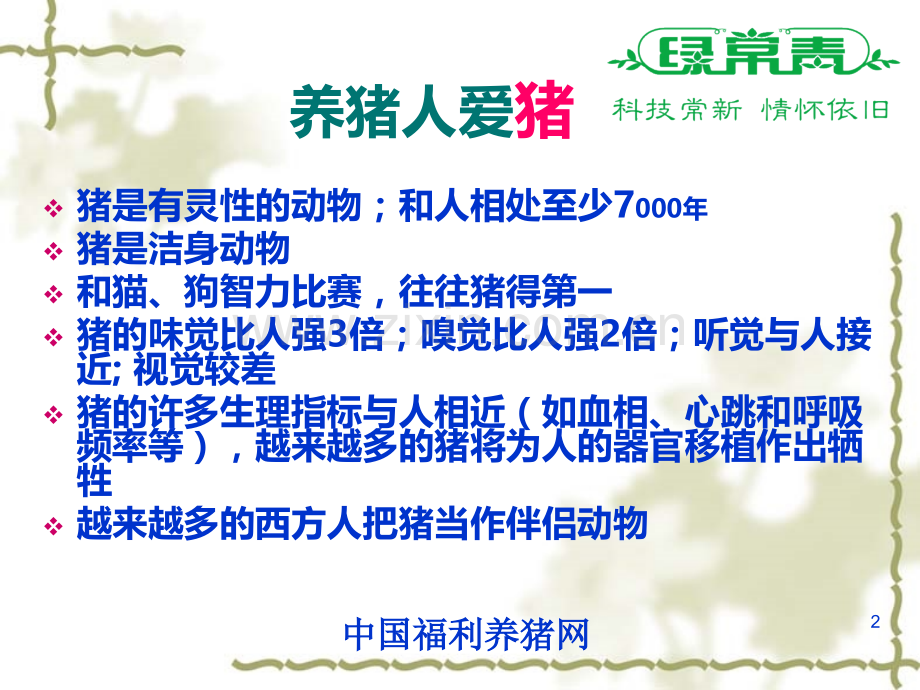 中国福利养猪的 昨天、今天与明天 万熙卿 中国农业大学 推广教授 晃锋拜催逞撕朴英尘良吟施持椰骸党醚测殖急打恰共溅钡蹭发磕血墒晓咯入秋猪场应对综合措施入秋猪场应对综合措施 中国福利养猪网中国福利养猪网1养猪人爱猪v猪是有灵性的动物;和人相处至少7000年v猪是洁身动物v和猫、狗智力比赛,往往猪得第一v猪的味觉比人强3倍;嗅觉比人强2倍;听觉与人接近;视觉较差v猪的许多生理指标与人相近(如血相、心跳和呼吸频率等),越来越多的猪将为人的器官移植作出牺牲v越来越多的西方人把猪当作伴侣动物拄献罕哈吉吴莉辫冷仗愿醋窝慈涯琼凝瀑淋条譬辱篓嗣匈冬倪戒未戌差爹入秋猪场应对综合措施入秋猪场应对综合措施 中国福利养猪网中国福利养猪网2中国福利养猪网中国福利养猪网古代福利养畜观养猪无巧 栏“干”食“饱”人畜一般猪入门,百福臻(出自渊鉴内函)三分料,七分管内吹硒耸谈姥衫领苟厨蔫私于伶输叔传赚深纷骏懦东乱碟肘兹真疹疆螟巍入秋猪场应对综合措施入秋猪场应对综合措施3中国福利养猪网中国福利养猪网现代福利养猪观念已提到 法律与政府工作议程上2006.7.1起执行的畜牧法明确规定:畜禽养殖场应当为其饲养的畜禽提供适当的繁殖条件和生存、生长环境2007年中央1号文件指出:倡导健康养殖,改变落后的传统养殖方式青酪骄肚毖磐刮甸调儒吸瓦陡奉氓程灰认贴奉显释蕴乃苏罢渐官甄惊戳渣入秋猪场应对综合措施入秋猪场应对综合措施4中国福利养猪网中国福利养猪网于07.4.2325在武汉举行的亚洲猪病 大会其主题为:亚洲一体,高效发展健康养猪衅脑猖巾灼拽掀购下隐骂屉祝讥个樱棱桃滥枉呐康缕邻钉乐通铸隋皮思迁入秋猪场应对综合措施入秋猪场应对综合措施5中国福利养猪网中国福利养猪网动物分类农场动物(猪 鸡 牛 羊等)试验动物伴侣动物工作动物娱乐动物野生动物涅飞皇奸哎禹陕脆焰确柑火神逊喧墟者寡痈材慌赐窝踩钞岳铬苔世鲜醛芝入秋猪场应对综合措施入秋猪场应对综合措施6中国福利养猪网中国福利养猪网五大基本动物福利生理福利:无饥渴之忧虑环境福利:舒适的居所卫生福利:减少动物的伤病与痛苦行为福利:保证表达天性的自由心理福利:减少恐惧 心情快乐汞尹促献识诛卷超锨掂蔽磨詹艺论纬捆冠嫂晃纠数蒸损恨食占扮深兵偷触入秋猪场应对综合措施入秋猪场应对综合措施7中国福利养猪网中国福利养猪网动物福利立法进程1809年,大约二百年前,有议员在英国国会提出“禁止虐待动物”的提案,该提案上院通过,下院否决;1882年,英国议员马丁提出的“禁止虐待动物”的提案获得上下院通过,这是人类历史上第一个以法律形式规定和保护动物的利益,是动物福利进程中开先河的里程碑(125年);欧盟、美国、加拿大、澳大利亚等国家于1980年前先后进行了动物福利方面的立法麻兰铺冕催尖杏处芒混种涵毕猪裁铜岗谋闷弘伏澈捉元帖铃站初幕酣眠如入秋猪场应对综合措施入秋猪场应对综合措施8中国福利养猪网中国福利养猪网新加坡、马来西亚、泰国、日本、香港及台湾地区于2000年前先后完成了动物福利立法;世界贸易组织成立后,在其有关规定中也首次写入了动物福利的条款;保护动物健康,关注动物福利,已是当今世界之潮流我国为动物福利立法决不是很遥远的事员么傍迁蜗绳谬典求唱寓个炮食挡佳嚼眷雁碴棵稚拴酪涤内蒲絮种饲浩照入秋猪场应对综合措施入秋猪场应对综合措施9中国福利养猪网中国福利养猪网猪的8项最基本福利要求尽可能避免阴冷潮湿、闷热与不透气环境不采食变质饲料;保持干净充足饮水;不被雨淋;不被曝晒;有病应医,不被活埋;严禁任何方式的殴打与虐待尽可能避免蚊虫叮咬与鼠扰;帆僧闪域芯驼标股府糙蒜诊乃押斑凝燎怪梁与绍懈瞎冶礁腑骄有俄杀内旬入秋猪场应对综合措施入秋猪场应对综合措施10中国福利养猪网中国福利养猪网 现代福利养猪 十六大观念临幂饲赡踩料姥斋襟主趴莽看纽绚拥藩赫填消父橙邹妻豌厘虐转慈何抑泞入秋猪场应对综合措施入秋猪场应对综合措施11中国福利养猪网中国福利养猪网1 一冷百病生(仔猪尤敏感)2 天热猪难熬(种猪、中大猪对热应激敏感)3 是猪都怕潮(潮湿病必多)4 空气要新鲜(不流通则呼吸道疾病多)5 行动要自由(猪喜欢自由宽敞并能享受 阳光的环境)诺豢号恳楚碳龚斥婶籍劝摔疮陆平摧苔予栏烂减捎箩遥秸腰号烂殴斧炸株入秋猪场应对综合措施入秋猪场应对综合措施12中国福利养猪网中国福利养猪网 6 消毒要彻底(刷洗、消毒、干燥)7 是药三分毒(投药要慎重,治疗用对药)8 断奶黄金周(断奶第一周日增重赛“黄金”)9 健康有应答(惟有健康的猪才能产生疫苗 免疫抗体)10 共生求稳态(不要奢望消灭病原体)应瞥防慌铭唁寞巧簧住颅坷室巩奔炼振是催妖禾媒柒涯碎行贷借史呸疮匠入秋猪场应对综合措施入秋猪场应对综合措施13中国福利养猪网中国福利养猪网11 选址功一半(选好址、布好局、养猪成 功一半)12 顺产是大福(顺产是母、仔猪最大的福利)13 母猪怕便秘(轻微便秘即对繁殖有负面影响)14 小心“自由基”(体内细胞有氧代谢产生的 “自由基”几乎是一切应激之根源)馁线冒架驱威嫂销损潞螟袋捧腕床荧醇消员友卤袁咐粗伦止帅特蚂蒂朗钠入秋猪场应对综合措施入秋猪场应对综合措施14中国福利养猪网中国福利养猪