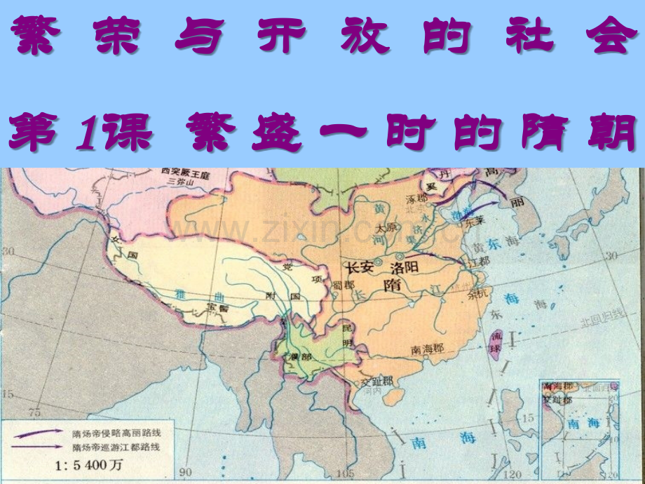 中国历史朝代顺序歌中国历史朝代顺序歌:夏商与西周,夏商与西周,东周分两段:东周分两段:春秋和战国,春秋和战国,一统秦两汉。一统秦两汉。三分魏蜀吴,三分魏蜀吴,两晋前后延。两晋前后延。南北朝并立,南北朝并立,隋唐五代传。隋唐五代传。宋元明清后,宋元明清后,王朝至此完。王朝至此完。繁繁 荣荣 与与 开开 放放 的的 社社 会会第第 1 1课课 繁繁 盛盛 一一 时时 的的 隋隋 朝朝132三国两晋南北朝三国两晋南北朝时期朝代更替简表时期朝代更替简表4东东晋晋十十六六国国齐齐梁梁9105东魏东魏北齐北齐6西魏西魏78魏魏蜀蜀吴吴西西晋晋北北魏魏北朝北朝南朝南朝宋宋陈陈北周北周统统一一全全国国隋隋学习目标学习目标1 1、知道隋朝的建立和统一、社会经、知道隋朝的建立和统一、社会经济发展的情况,掌握大运河的开通等济发展的情况,掌握大运河的开通等基本史实。基本史实。2 2、认识社会安定是经济发展的有力、认识社会安定是经济发展的有力保障,我国古代劳动人民的聪明才智保障,我国古代劳动人民的聪明才智和创造性。和创造性。一、隋朝统一南北一、隋朝统一南北1 1、隋朝的建立和统一(课本、隋朝的建立和统一(课本p2p2)建立时间:建立时间:建建 立立 者:者:都城:都城:统一时间:统一时间:581年年杨坚杨坚长安长安589年年公元公元589年,隋朝大年,隋朝大军南下,渡过长江,进改南军南下,渡过长江,进改南方陈国。方陈国。陈朝后主陈叔宝陈朝后主陈叔宝奢奢侈腐化,宴游无度,当他听侈腐化,宴游无度,当他听说建康城已陷落时,慌忙带说建康城已陷落时,慌忙带着他的两个嫔妃,躲入宫廷着他的两个嫔妃,躲入宫廷内的一口枯井里。隋军呼喊内的一口枯井里。隋军呼喊他们不出来,扬言要往井里他们不出来,扬言要往井里投石头,陈后主才和两个妃投石头,陈后主才和两个妃嫔出来投降。陈后主携二妃嫔出来投降。陈后主携二妃躲入的枯井,被后人嘲笑为躲入的枯井,被后人嘲笑为“胭脂井胭脂井”。据说这口井就。据说这口井就在今天南京鸡鸣寺的山坡下。在今天南京鸡鸣寺的山坡下。胭脂井胭脂井 泊秦淮 杜牧 烟笼寒水月笼沙,夜泊秦淮近酒家。商女不知亡国恨,隔江犹唱后庭花。隋统一的原因隋统一的原因是什么是什么?小组讨论分析:隋朝为什么能够统一全国呢?隋朝为什么能够统一全国呢?客观条件:客观条件:长期以来,由于北方民族的大融合,南北对峙的长期以来,由于北方民族的大融合,南北对峙的民族矛盾逐渐消失;民族矛盾逐渐消失;江南经济发展,南北经济发展水平差距缩小,为江南经济发展,南北经济发展水平差距缩小,为隋朝统一全国提供了物质条件;隋朝统一全国提供了物质条件;广大人民经过长期的战乱,向往统一。广大人民经过长期的战乱,向往统一。南朝陈政权本身的腐朽。南朝陈政权本身的腐朽。主观条件:主观条件:隋文帝励精图治,政治稳定,经济繁荣,军事强大隋文帝励精图治,政治稳定,经济繁荣,军事强大隋朝为灭陈做了充分准备,战略运用得当。隋朝为灭陈做了充分准备,战略运用得当。隋朝完成统一的作用、意义:隋朝完成统一的作用、意义:1 1、结束了西晋末年以来二百、结束了西晋末年以来二百七十多年的分裂、对峙局面。七十多年的分裂、对峙局面。2 2、开创了隋唐三百七十余年、开创了隋唐三百七十余年的大一统局面的大一统局面3 3、为经济文化的繁荣发展奠、为经济文化的繁荣发展奠定了基础。定了基础。二、隋朝经济的繁荣:二、隋朝经济的繁荣:找一找隋朝经济繁荣的表现有哪些?找一找隋朝经济繁荣的表现有哪些?时间时间项目项目隋初隋初隋盛世隋盛世结论结论人口人口3000多万多万人人4600多万多万人人垦田垦田1900多万多万顷顷5500多万多万顷顷粮仓粮仓长安太仓长安太仓洛阳含嘉仓、洛阳含嘉仓、兴洛仓兴洛仓人口激增人口激增垦田扩大垦田扩大粮仓丰实粮仓丰实计天下储积,得供五六十年计天下储积,得供五六十年贞观政要贞观政要古今称国计之富者莫如隋古今称国计之富者莫如隋文献通考文献通考二、隋朝社会经济的繁荣(二、隋朝社会经济的繁荣(p3)原因:原因:表现:表现:国家统一,社会安定;国家统一,社会安定;隋文帝励精图治,改革制隋文帝励精图治,改革制度,发展生产,注重吏治。度,发展生产,注重吏治。人口有大幅度增长;人口有大幅度增长;在长安、洛阳一带修建了许在长安、洛阳一带修建了许多大仓库。多大仓库。三、大运河的开通三、大运河的开通目的:目的:时间、在位皇帝:时间、在位皇帝:中心:中心:南北至点:南北至点:地位:地位:作用:作用:加强南北交通,巩固隋王朝对全国的统治加强南北交通,巩固隋王朝对全国的统治 605605年、隋炀帝年、隋炀帝 洛阳洛阳 北达北达涿郡涿郡,南至南至余杭余杭,全长两千多公里,是世界上最全长两千多公里,是世界上最长的古代运河。长的古代运河。大大促进了我国南北经济的交流。大大促进了我国南北经济的交流。美丽的琼花美丽的琼花大运河示意图大运河示意图以以洛洛阳阳为为中中心心永济渠永济渠通济渠通济渠邗沟邗沟江南河江南河涿郡涿郡余杭余杭全全长长两两千千多多公公里里尽道隋亡为此河,尽道隋亡为此河,至尽千里赖通波。至尽千里赖通波。若无水殿龙舟事若无水殿龙舟事,共禹论功不较多。共