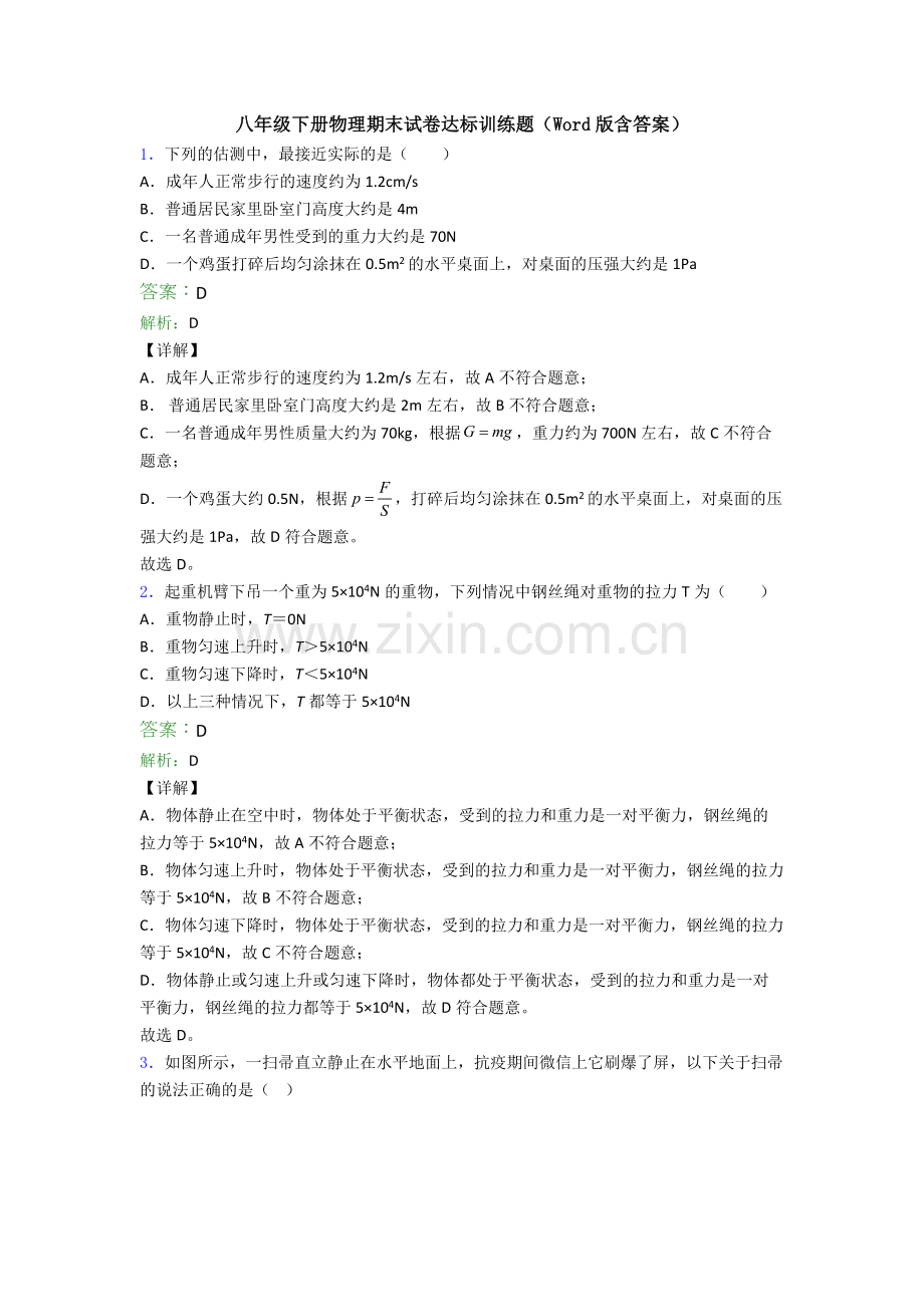 八年级下册物理期末试卷达标训练题(Word版含答案)