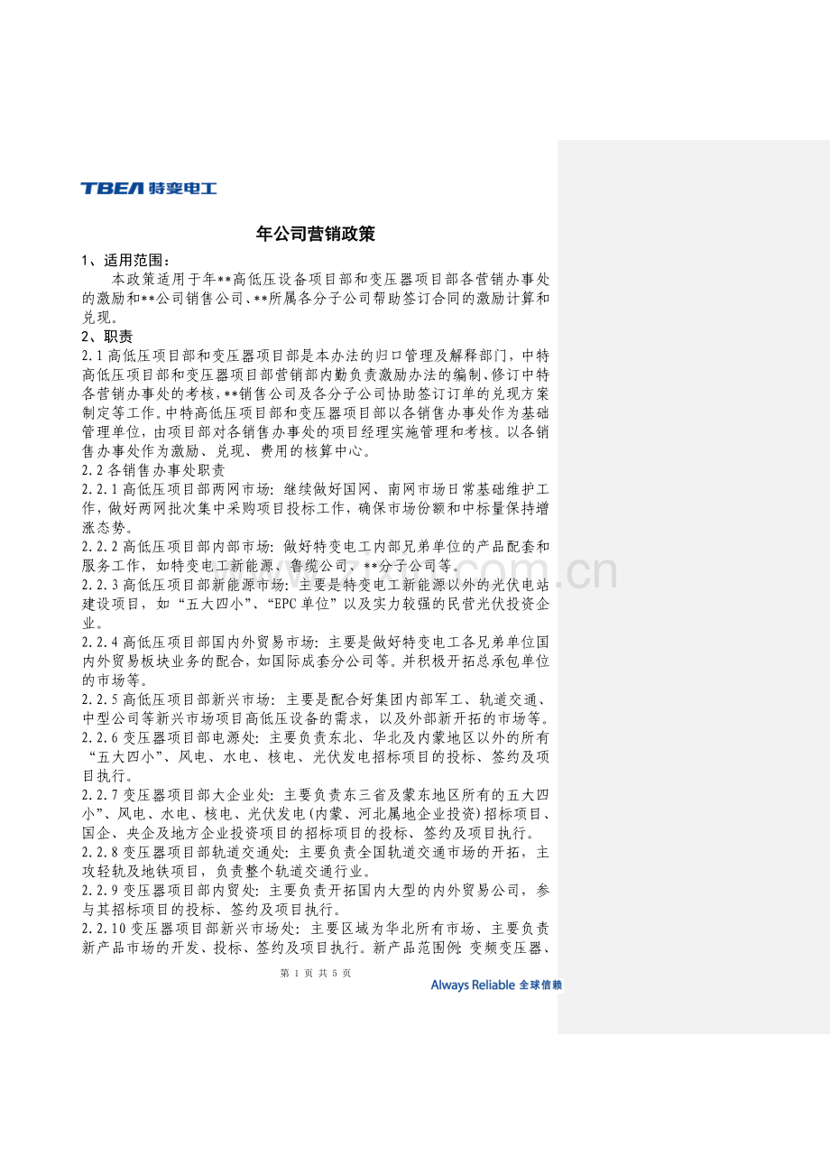 本政策适用于年**高低压设备项目部和变压器项目部各营销办事处的激励和**公司销售公司、**所属各分子公司帮助签订合同的激励计算和兑现。