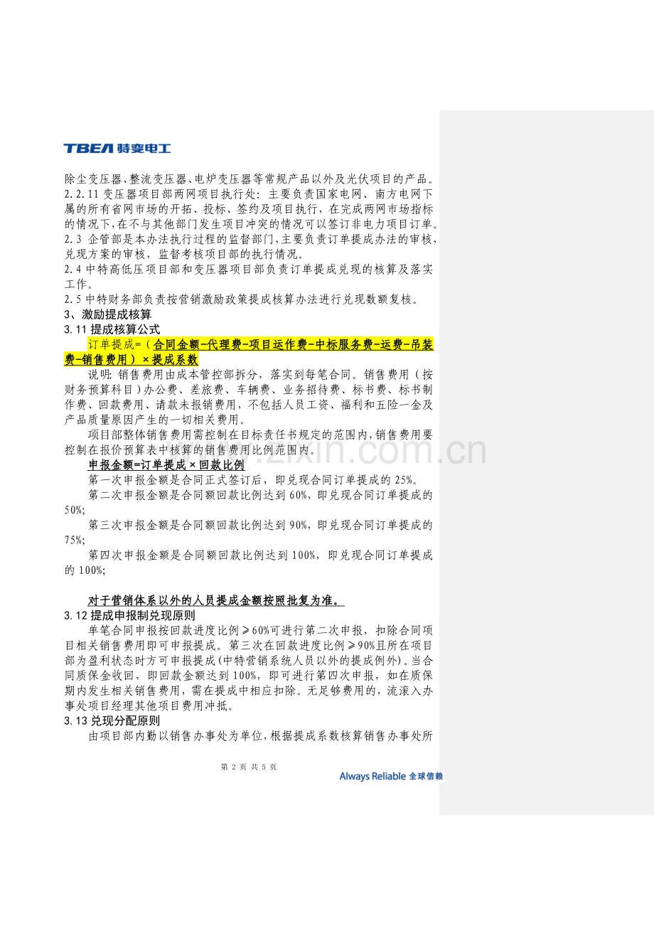 2.4中特高低压项目部和变压器项目部负责订单提成兑现的核算及落实工作。