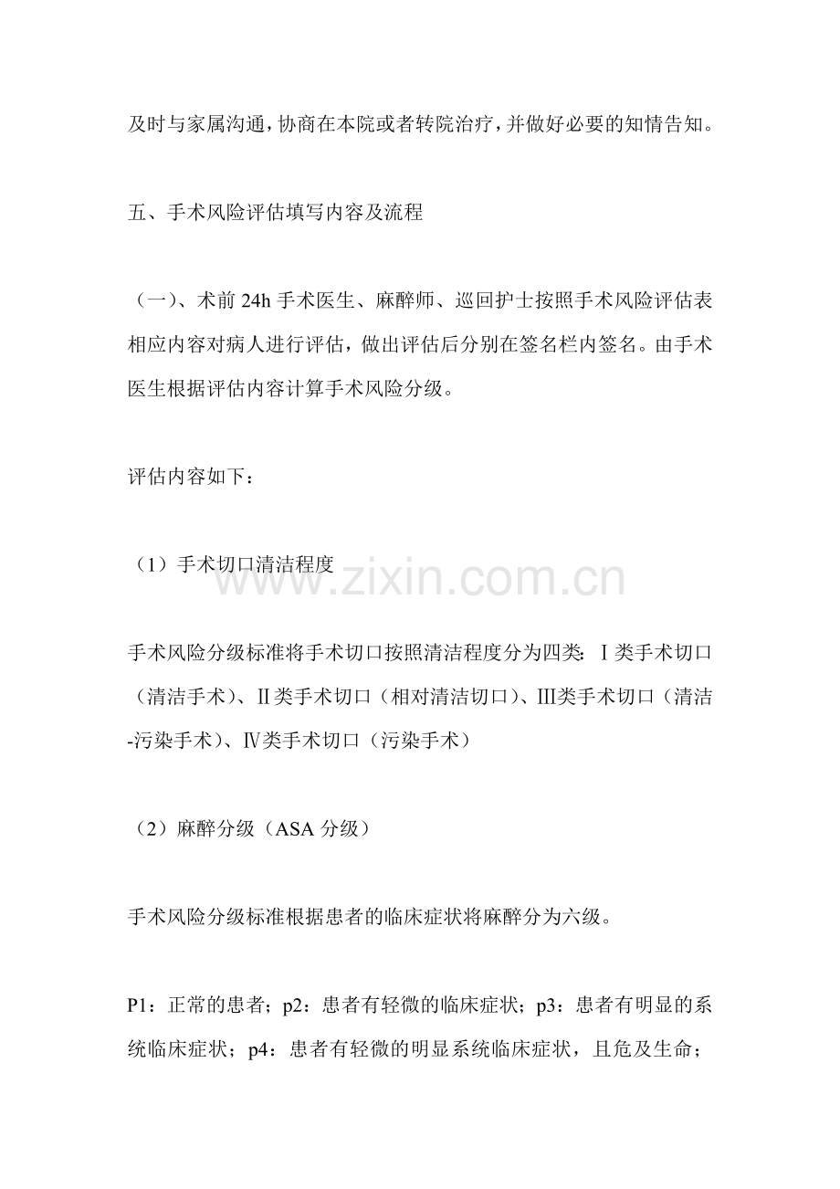 (一)、术前24h手术医生、麻醉师、巡回护士按照手术风险评估表相应内容对病人进行评估,做出评估后分别在签名栏内签名。由手术医生根据评估内容计算手术风险分级。
