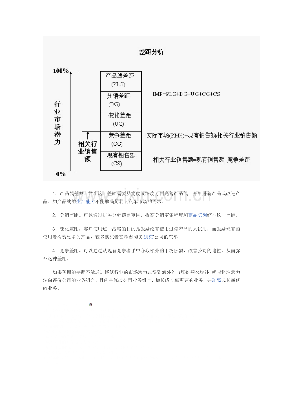 差距分析的第一步是考虑修改公司战略。如果期望业绩超过目标,可以将目标定得高一些。当目标大大超过可能取得的绩效时,也许必须将目标修改的低一些在做出这些调整之后,如果仍然存在显著差距,就需要提出新的战略来消除这种差距。由于为每一项业务引入了备选择增长战略,经理人员可能预测销售将增长,他们能够通过以下指标估计市场结构: