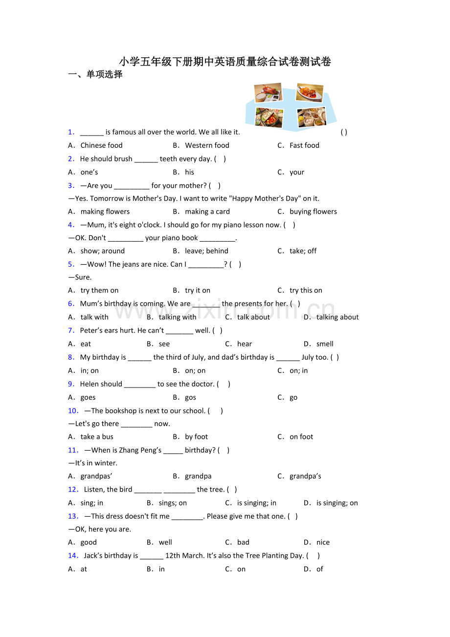 小学五年级下册期中英语质量综合试卷测试卷