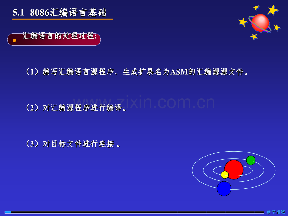 汇编语言汇编语言第第 5章章5.180865.18086汇编语言基础汇编语言基础汇编语言基础汇编语言基础 5.1.15.1.1汇编语言基本语法汇编语言基本语法汇编语言基本语法汇编语言基本语法 5.1.25.1.2汇编语言语句汇编语言语句汇编语言语句汇编语言语句5.1.35.1.3伪指令语句伪指令语句伪指令语句伪指令语句5.1.45.1.4宏指令语句宏指令语句宏指令语句宏指令语句 5.25.2汇编语言程序设计汇编语言程序设计汇编语言程序设计汇编语言程序设计 5.2.15.2.1顺序程序设计顺序程序设计顺序程序设计顺序程序设计5.2.25.2.2分支程序设计分支程序设计分支程序设计分支程序设计5.2.35.2.3循环程序设计循环程序设计循环程序设计循环程序设计5.2.45.2.4子程序设计子程序设计子程序设计子程序设计5.2.5DOS5.2.5DOS功能调用功能调用功能调用功能调用.汇编语言的处理过程汇编语言的处理过程汇编语言的处理过程汇编语言的处理过程:(1 1)编写汇编语言源程序,生成扩展名为)编写汇编语言源程序,生成扩展名为)编写汇编语言源程序,生成扩展名为)编写汇编语言源程序,生成扩展名为ASMASM的汇编源源文件。的汇编源源文件。的汇编源源文件。的汇编源源文件。(2 2)对汇编源程序进行编译。)对汇编源程序进行编译。)对汇编源程序进行编译。)对汇编源程序进行编译。(3 3)对目标文件进行连接)对目标文件进行连接)对目标文件进行连接)对目标文件进行连接。教学进程教学进程教学进程教学进程5.15.1 80868086汇编语言基础汇编语言基础汇编语言基础汇编语言基础.1 1)效率低(与人们描述计算过程的需要差距大);)效率低(与人们描述计算过程的需要差距大);)效率低(与人们描述计算过程的需要差距大);)效率低(与人们描述计算过程的需要差距大);2 2)机机机机器器器器硬硬硬硬件件件件的的的的具具具具体体体体结结结结构构构构联联联联系系系系过过过过于于于于紧紧紧紧密密密密在在在在一一一一种种种种结结结结构构构构的的的的机机机机器器器器上上上上开开开开发发发发的程序极难移植到另一种不同结构的机器上去。的程序极难移植到另一种不同结构的机器上去。的程序极难移植到另一种不同结构的机器上去。的程序极难移植到另一种不同结构的机器上去。教学进程教学进程教学进程教学进程5.15.1 80868086汇编语言基础汇编语言基础汇编语言基础汇编语言基础汇编语言进行程序设计的优点汇编语言进行程序设计的优点汇编语言进行程序设计的优点汇编语言进行程序设计的优点1 1)充分利用机器的硬件功能和结构特点,加快程序的执行速度,)充分利用机器的硬件功能和结构特点,加快程序的执行速度,)充分利用机器的硬件功能和结构特点,加快程序的执行速度,)充分利用机器的硬件功能和结构特点,加快程序的执行速度,减少目标程序所占用的存储空间;减少目标程序所占用的存储空间;减少目标程序所占用的存储空间;减少目标程序所占用的存储空间;2 2)用来编写实时控制程序、实时通信程序,有时也用来编制某些)用来编写实时控制程序、实时通信程序,有时也用来编制某些)用来编写实时控制程序、实时通信程序,有时也用来编制某些)用来编写实时控制程序、实时通信程序,有时也用来编制某些系统软件程序。系统软件程序。系统软件程序。系统软件程序。汇编语言进行程序设计缺点汇编语言进行程序设计缺点汇编语言进行程序设计缺点汇编语言进行程序设计缺点.教学进程教学进程教学进程教学进程宏宏宏宏指指指指令令令令语语语语句句句句是是是是由由由由编编编编程程程程者者者者按按按按照照照照一一一一定定定定的的的的规规规规则则则则来来来来定定定定义义义义的的的的一一一一种种种种较较较较“宏大宏大宏大宏大”的指令,可包括多条指令或伪指令。的指令,可包括多条指令或伪指令。的指令,可包括多条指令或伪指令。的指令,可包括多条指令或伪指令。汇编语言基本语法汇编语言基本语法汇编语言基本语法汇编语言基本语法 在在在在8086808680868086汇编中使用的语句可以分成汇编中使用的语句可以分成汇编中使用的语句可以分成汇编中使用的语句可以分成3 3 3 3种类型种类型种类型种类型这类指令能够产生目标代码,是这类指令能够产生目标代码,是这类指令能够产生目标代码,是这类指令能够产生目标代码,是CPUCPUCPUCPU可以执行的能够完成可以执行的能够完成可以执行的能够完成可以执行的能够完成特定功能的语句,主要由机器指令组成。在汇编时一条指特定功能的语句,主要由机器指令组成。在汇编时一条指特定功能的语句,主要由机器指令组成。在汇编时一条指特定功能的语句,主要由机器指令组成。在汇编时一条指令语句被翻译成对应的机器码,对应着特定的操作。令语句被翻译成对应的机器码,对应着特定的操作。令语句被翻译成对应的机器码,对应着特定的操作。令语句被翻译成对应的机器码,对应着特定的操作。指令语句:指令语句:指令语句:指令语句:伪指令语句:伪指令语句:伪指令语句:伪指令语句:伪指令语句是为汇编程序和连接程序提供一些必要控制的伪指令语句是为汇编程序和连接程序提供一些必要控制的伪指令语句是为汇编程序和连接程序提供一些必要控制的伪指令语句是为汇编程序和连接程序提供一些必要控制的管理性语