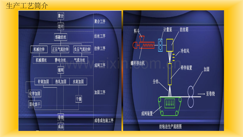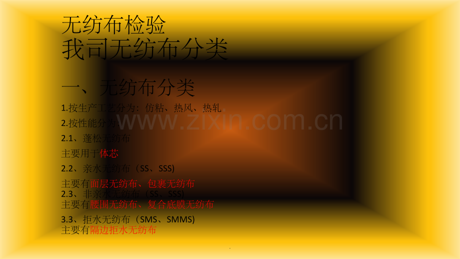 无纺布检验我司无纺布分类一、无纺布分类1.按生产工艺分为:仿粘、热风、热轧2.按性能分为:2.1、蓬松无纺布主要用于体芯2.2、亲水无纺布(SS、SSS)主要有面层无纺布、包裹无纺布2.3、非亲水无纺布(SS、SSS)主要有腰围无纺布、复合底膜无纺布3.3、拒水无纺布(SMS、SMMS)主要有隔边拒水无纺布.生产工艺简介.无纺布实样.一、外观检测:(方法:目测目测)1、外包装不得破损.2、标识:供应商名称、品名、规格、批号。实物、标签、送货单要统一。.3、拆开包装(目测、嗅觉)3.1、不得出现脏污、蚊虫、异物;3.2、检查材料是否起毛、褶皱、破洞、柔软度、均匀度、有无异味。3.3、接头每卷1,批总数5%,接头为黑色胶带。4、端面平整度4.1、收卷松紧一致,纸筒不得变形,脱筒,分切整齐、无毛边,4.2、纸筒与无纺布端面平整,单面允许偏差:拒水、亲水无纺布:3mm3mm。蓬松无纺布:20mm20mm5、确定材料使用面朝向,核实供应商使用面标识是否正确。光面为使用面,毛面为喷胶面。.二、宽幅、卷径、纸筒直径量取(钢(卷)板尺量取)1、卷径、纸筒直径量取 拆开无纺布包装后,用钢板(卷)尺量取无纺布横切面最大值(即无纺布横切面圆形的直径)即为卷径,卷径要求详见卷径表。量取纸筒内圈最大值,即为纸筒直径,要求7676 1mm1mm。圆柱度:取同一卷无纺布最大卷径、最小卷径,计算算术差(差值=最大值-最小值),差值10mm。.2、宽幅量取 将需检测的无纺布卷平放(即无纺布横切面竖立,布面处于水平状态,保证无纺布宽幅不会因重力作用而变小),用钢板(卷)尺量取3点,取数据平均值,作为该卷的宽幅。宽幅标准:拒水无纺布:2mm;亲水无纺布:打孔布:3mm3mm,非打孔布:2mm2mm;蓬松无纺布:30mm。.三、定量检测1、拆开无纺布包装后取适当的无纺布样,选取样品折叠整齐,不可用力按压。取样完成后将无纺布包好,放置原位。2、定量检测方法:2.1、方法一:测试样平铺在橡胶垫上,用圆盘取样器取样,取10片样品,用精确到0.01g电子秤称重,所得重量(G1)为该试样的平方克重的十分之一,平方克重(定量)=试样重量*10。例1:某样品试样重量为4.16g,其平方克重为:4.16*10=41.6g。2.2、方法二:取试样1M,测量其宽幅(W),用电子秤称量1M试样的克重(G2)。计算方法:试样平方克重g=G2/W。例2:某测试样其宽幅(W)为 0.09M,其试样克重(G2)为5.88g,则其平方克重为:5.88/0.09=65.3g2.32.3、无纺布克重标准(、无纺布克重标准(g g):):2.3.12.3.1、拒水无纺布、拒水无纺布热风:热风:+1.5 -2.5+1.5 -2.5;仿粘:;仿粘:+1-2+1-22.3.22.3.2、亲水无纺布、亲水无纺布仿粘仿粘/热轧:热轧:+1-2 +1-2 热风:热风:+1.5-2.5+1.5-2.52.3.32.3.3、蓬松无纺布、蓬松无纺布定量定量30g30g,+1-3+1-3;定量定量30g30g,+1-5+1-5.方法一:.方法二:.四、断裂强度、断裂伸长率1、取样沿无纺布横向、纵向用裁刀各裁取宽度为50mm试样2、测试2.1、电子强力机调试:拉速100mm/min 试样宽度:50mm2.2、将单层试样两端分别固定在电子强力机夹头上,启动设备进行测试。2.3、测试完成后,设备自动复位,读取显示屏上的断裂强度、断裂伸长率,并记录结果。3、实验结束,清理设备。3、标准.五、亲水性测试1.辅助工具:十孔板、生理盐水(0.9%NaCl溶液)、定性滤纸、胶头滴管、秒表。2.测试步骤:2.1、在操作台上铺上定性滤纸。2.2、将已裁好的无纺布样品光面朝上放置于滤纸上,将十孔板沿与MD呈约1545角放置。2.3、用胶头滴管吸取生理盐水,滴管口应距十孔板表面5mm,依次将水点滴入十孔内。2.4、记录渗透过的点数N1。每滴水的渗透时间应为1s,1s的计为不透过的点。2.5、保持十孔板及样品不动,等待5分钟,重复步骤2.3和2.4,记录渗透过的点数N2。注意:在此次滴水过程中,对于前次未透过的点不必再滴水,直接记为不透过的点。2.6、重复步骤2.5,即为第三次渗透N3。N2+N35合格3、实验结束后清理器材,待下次使用3、标准:.六、拒水性测试1、辅助工具:数字式渗水性测试仪2、准备工作:2.1、无纺布试样取样:试样大小要求:20*20cm2.2、设备预热:检查设备电源、水打开电源按下加水按钮(设备加水10min)3、检验步骤:3.1、将取好的待测试样放置在数字式渗水测试仪上(光面朝下)3.2、点击设备上开始按钮,开始测试3.3、观察试样表层渗透点,待试样表层渗透点达到3个时,点击停止按钮。结束测试,记录显示屏上的数据。4、实验结束后清理设备。.七、起毛测试1、辅助工具:织物平磨仪2、准备工作2.1、取样:要求20*20cm2.2、固定试样2.2.1、将试样固定在织物平磨仪底座上,光面朝上;2.2.2、将试样放置在固定样底座上(光面朝下);2.2.3、将羊毛垫放置在试样上;2.2.4、将托盘放置在羊毛垫上;2.2.5、用专用橡皮圈将试样固定在托盘上,剪去多余试样。2.2.6、将砝码压在托盘上,用连接杆将托盘固定在织物平磨仪底座上。3、试样测试3.1、检查设备电源,打开电源开关,启动设备。3.2、设置参数即平磨次数(平磨次数:热轧、仿粘:90次,热风:60次)3.3、参数设置完毕点击开始按钮,设备开始自动工作。3.4、设备停止运行后,取下试样,观察并记录试样起球情况。4、试验结束后,清理设备.