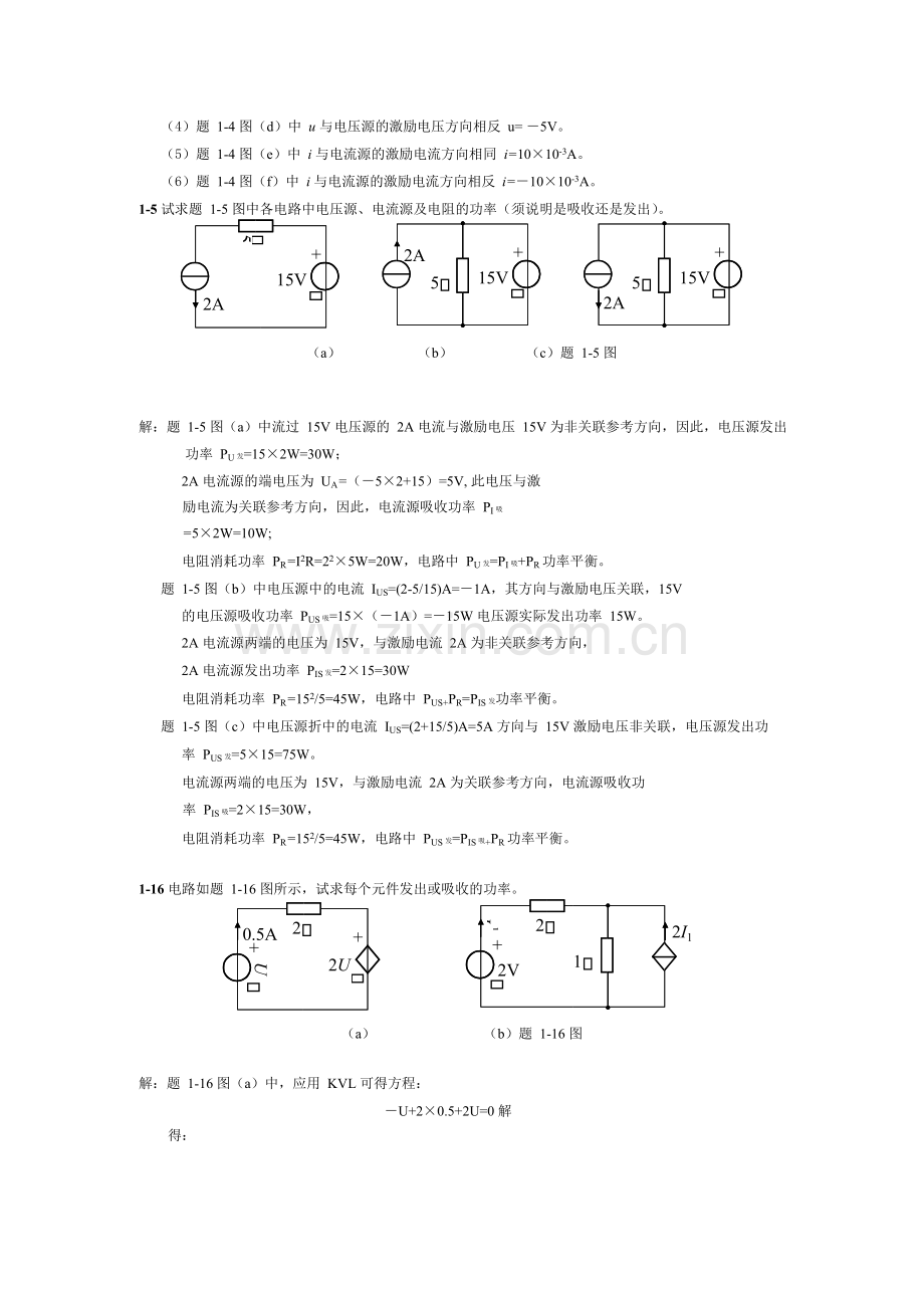(3) 题 1-1 图(a)中,P=ui<0 表示元件吸收负功率,实际发出功率。题 1-1 图(b)中,P=ui>0,元件实际发出功率。