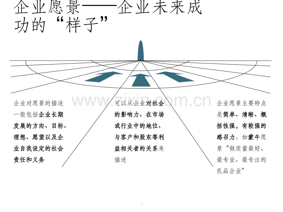 企业愿景企业未来成功的“样子”愿愿 景景企业对愿景的描述一般包括企业长期企业长期发展的方向、目标、发展的方向、目标、理想、愿望以及企理想、愿望以及企业自我设定的社会业自我设定的社会责任和义务责任和义务可以从企业对社会对社会的影响力、在市场的影响力、在市场或行业中的地位、或行业中的地位、与客户和股东等利与客户和股东等利益相关者的关系益相关者的关系来描述企业愿景主要特点是简单、清晰、概简单、清晰、概括性强,有较强的括性强,有较强的感召力感召力。如蒙牛蒙牛愿景“做质量最好、最专业、最专注的乳品企业”.企业使命企业在社会中的分工和责任企业使命是企业愿景的一个方面,企业企业使命是企业愿景的一个方面,企业使命是企业愿景中具体说明企业经济活使命是企业愿景中具体说明企业经济活动和行为的理念。动和行为的理念。企业使命要回答企业在全社会经济领域经营活动的范围、层次、角色定位,具体表述企业的分工是什么,为社会做的贡献是什么。使使 命命一般从本企业是干什么的,为哪一类顾客服务,我们对顾客的价值是什么,我们的业务是什么等这些问题进行描述。如蒙牛蒙牛使命“为消费者奉献安全、优质、健康的乳制品,为客户、员工、股东及所有利益相关斱共成长”。.企业核心价值观企业处理内外矛盾的一系列准则如果愿景要描述的是到哪里去,使命要描述的是去干什么,那么核心价值观是为实现使命而提炼出来并予以倡导的、指导公司员工共同行为的永恒准则。是企业在经营过程中坚持不懈,努力使全体员工都必需信奉的信条。是解决企业在发展中如何处理内外矛盾的一系列准则,是判断善恶的标准,是终极判断的原则。p确保价值理念确实反映了公司的长远目标。p价值理念应该激励人心。p找出那些会引起企业价值观朝理想方向转变的行为和惯例。p确保使用简单易懂的语言,能明白无误地转换成行为。价值观优化的原则价值观优化的原则p是重要的关键理念,通常5-6条。p是企业核心团队或者是企业家本人发自内心的肺腑之言,是企业家在企业经营过程中身体力行并坚守的理念。p是真正影响企业运作的精神准则,是经得起时间考验的,因此它一旦确定下来就不会轻易改变。特征特征.企业精神企业向心力和凝聚力的源泉p是企业现实状况的客观反映,企业生产力状况是企业精神产生和存在的依据。p是全体员工共同拥有、普遍掌握的理念。p是稳定性和动态性的统一。一旦确立,就相对稳定,但还是会随着企业的发展而不断发展的。p要求务实和求精精神。务实,就是从实际出发,遵循客观规律,注意实际意义,切忌凭空设想和照搬照抄。求精,就是要求企业经营上高标准、严要求,不断致力于企业产品质量、服务质量的提高。p具有时代性。企业精神是时代精神的体现,是企业个性和时代精神相结合的具体化。p是现代意识与企业个性相结合的一种群体意识。p是企业全体或多数员工共同一致,彼此共鸣的内心态度、意志状况和思想境界。p是正向的心理定势、价值取向和主导意识。p是企业向心力和凝聚力的源泉。p其信念化的结果,会大大提高员工主动承担责任和修正个人行为的自觉性,从而主动的关注企业的前途,维护企业声誉,为企业贡献自己的全部力量。企业精神定义及信念化后的结果企业精神定义及信念化后的结果特征特征.