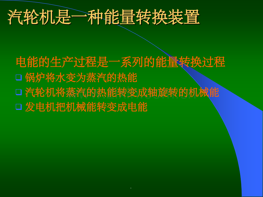 汽轮机工作原理及结构汽轮机工作原理及结构2013年11月.汽轮机是一种能量转换装置汽轮机是一种能量转换装置电能的生产过程是一系列的能量转换过程电能的生产过程是一系列的能量转换过程q锅炉将水变为蒸汽的热能锅炉将水变为蒸汽的热能q汽轮机将蒸汽的热能转变成轴旋转的机械能汽轮机将蒸汽的热能转变成轴旋转的机械能q发电机把机械能转变成电能发电机把机械能转变成电能.火力发电厂生产工艺流程.汽轮机的优点汽轮机的优点热效率高热效率高 凝汽式汽轮机组综合热效率高达凝汽式汽轮机组综合热效率高达40%供热式机组综合热效率高达供热式机组综合热效率高达80%(55)连续工作的回转机械,可以具有较大功率连续工作的回转机械,可以具有较大功率 目前单台机组容量已突破目前单台机组容量已突破1300MW运转平稳、事故率较低、充分提高了设备利运转平稳、事故率较低、充分提高了设备利用率用率 一般可保持一般可保持34年大修一次年大修一次.汽轮机的基本概念 汽轮机是用具有一定温度和压力汽轮机是用具有一定温度和压力的蒸汽来做功的回转式原动机的蒸汽来做功的回转式原动机。按。按其做功原理的不同,可分为冲动式其做功原理的不同,可分为冲动式汽轮机和反动式汽轮机两种类型。汽轮机和反动式汽轮机两种类型。蒸汽热能蒸汽热能 动能动能 机械能机械能.冲动式汽轮机工作原理冲动式汽轮机工作原理l蒸汽在喷嘴中发生膨胀,压力降低,速度增加,热能转变为动能。高速汽流流经动叶片3时,由于汽流方向改变,产生了对叶片的冲动力,推动叶轮2旋转作功,将蒸汽的动能变成叶轮轴旋转的机械能。这种利用冲动力作功的原理,称为冲动作用原理。.单级冲动式汽轮机单级冲动式汽轮机 左图所示:蒸汽在喷嘴中发生膨胀,压力由p0降至p1,流速从c0增至c1,将蒸汽的热能转变为动能。蒸汽进入动叶栅后,改变流动方向,产生了冲动作用力使叶轮旋转作功,将蒸汽动能转变为转子的机械能。蒸汽离开动叶栅的速度降至c2。由于蒸汽在动叶栅中不膨胀,所以动叶栅前后压力相等,即p1=p2。冲动式汽轮机的动叶片出,入口侧的横截面相对比较匀称,气流流道从入口到出口其面积基本不变。(针对动叶片).双列汽轮机工作原理双列汽轮机工作原理.多级冲动式汽轮机多级冲动式汽轮机 左图所示为一种具有三个冲动级的多级冲动式汽轮机。整个汽轮机的比焓降分别由三个冲动级加以利用。蒸汽进入汽缸后,在第一级喷嘴2中发生膨胀,压力由p0降至p1,汽流速度由co增至c1,然后进入第一级动叶栅3中作功,作功后流出动叶栅的汽流速度降至c2,由于蒸汽在动叶栅中不发生膨胀,动叶栅后的压力(即第一级后压力)即等于喷嘴后的压力p1,从第一级流出的蒸汽,再依次进入其后的两级并重复上述作功过程,最后从排汽管中排出。.反动作用原理反动作用原理蒸汽的热能转变为动能的过程,不仅在喷嘴中发生,而且在动叶片中也同样发生的汽轮机,叫做反动式汽轮机。在反动式汽轮机中,蒸汽不但在喷嘴(静叶栅)中产生膨胀,压力由p0降至p1,速度由c0增至c1,高速汽流对动叶产生一个冲动力;而且在动叶栅中也膨胀,压力由p1降至p2,速度由动叶进口相对速度w1增至动叶出口相对速度w2,汽流必然对动叶产生一个由于加速而引起的反动力,使转子在蒸汽冲动力和反动力的共同作用下旋转作功。反动式汽轮机的动叶片出,入口侧的横截面不对称,叶型入口较肥大,而出口侧较薄,蒸汽流道从入口到出口呈渐缩状。(针对动叶片).多级反动式汽轮机剖面图多级反动式汽轮机剖面图.汽轮机的分类汽轮机的分类-1l l按热力过程特性分类按热力过程特性分类按热力过程特性分类按热力过程特性分类凝汽式汽轮机凝汽式汽轮机 进入汽轮机的蒸汽,除很少一部分泄漏外,全部排入凝汽器。背压式汽轮机背压式汽轮机 排汽压力高于大气压力的汽轮机称为背压式汽轮机。调节抽汽式汽轮机调节抽汽式汽轮机 部分蒸汽在一种或两种给定压力下抽出对外供热,其余蒸汽作功后仍排入凝汽器。中间再热式汽轮机中间再热式汽轮机 新蒸汽经汽轮机前几级作功后,全部引至加热装置再次加热到某一温度,然后再回到汽轮机继续作功。.汽轮机的分类汽轮机的分类-2按工作原理分类按工作原理分类 v冲动式汽轮机冲动式汽轮机 按冲动作用原理工作的汽轮机称为冲动式汽轮机按冲动作用原理工作的汽轮机称为冲动式汽轮机 v反动式汽轮机反动式汽轮机 按反动作用原理工作的汽轮机称为反动式汽轮机按反动作用原理工作的汽轮机称为反动式汽轮机 v混合式汽轮机混合式汽轮机 由按冲动原理工作的级和按反动原理工作的级组合而成由按冲动原理工作的级和按反动原理工作的级组合而成的汽轮机称为混合式汽轮机的汽轮机称为混合式汽轮机.汽轮机的分类汽轮机的分类-3按新按新(主主)蒸汽压力分类蒸汽压力分类 低压汽轮机新蒸汽压力为低压汽轮机新蒸汽压力为1.2 MPa1.2 MPa2MPa2MPa;中压汽轮机新蒸汽压力为中压汽轮机新蒸汽压力为2.1 MPa2.1 MPa8MPa8MPa;高压汽轮机新蒸汽压力为高压汽轮机新蒸汽压力为8.1 MPa8.1 MPa12.5MPa12.5MPa;超高压汽轮机超高压汽轮机 新蒸汽压力为新蒸汽压力为12.6MPa12.6MPa15.1MPa15.1MPa;亚临界汽轮机亚临界汽轮机 新蒸汽压力为新蒸汽压力为15.1MPa15.1MPa22MPa22MPa;超临界汽轮机超临界汽轮机 新蒸汽压