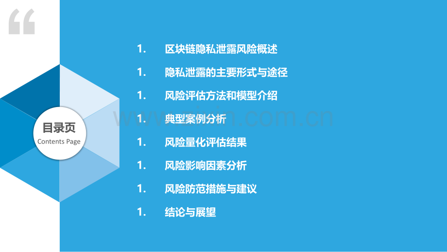 数智创新数智创新数智创新数智创新 变革未来变革未来变革未来变革未来区块链隐私泄露风险评估1.区块链隐私泄露风险概述1.隐私泄露的主要形式与途径1.风险评估方法和模型介绍1.典型案例分析1.风险量化评估结果1.风险影响因素分析1.风险防范措施与建议1.结论与展望Contents Page目录页 区块链隐私泄露风险概述区区块链隐块链隐私泄露私泄露风险评风险评估估 区块链隐私泄露风险概述区块链隐私泄露风险概述1.区块链技术的透明性:区块链上的交易和数据对所有参与者公开,这种透明性可能导致个人隐私泄露。2.数据加密与安全性:虽然区块链技术本身具有较强的安全性,但如果加密方法被破解或密钥丢失,可能导致隐私数据泄露。3.隐私保护法律法规:各国对区块链技术的隐私保护法律法规不同,可能存在一定的法律漏洞,增加隐私泄露风险。区块链隐私泄露案例分析1.案例分析:分析近年来发生的区块链隐私泄露事件,探讨其泄露途径和原因。2.影响评估:评估这些泄露事件对个人和企业的影响,以及对区块链行业的信誉和发展的影响。3.经验教训:总结教训,提出针对性的改进措施,降低类似事件的再次发生。区块链隐私泄露风险概述区块链隐私保护技术与发展趋势1.隐私保护技术:介绍当前区块链领域的隐私保护技术,如零知识证明、环签名等。2.发展趋势:分析区块链隐私保护技术的发展趋势和未来可能的应用场景。3.前景展望:展望区块链技术在保护个人隐私方面的前景,以及可能面临的挑战和机遇。以上内容仅供参考,具体内容需要根据实际的研究和分析结果来确定。隐私泄露的主要形式与途径区区块链隐块链隐私泄露私泄露风险评风险评估估 隐私泄露的主要形式与途径网络攻击1.黑客利用漏洞入侵系统,窃取敏感数据。2.钓鱼攻击和社交工程手段骗取个人信息。3.勒索软件攻击,加密数据并索取赎金。随着网络技术的不断发展,黑客和攻击者也在不断进步,利用漏洞和弱点入侵系统,窃取个人和组织的数据。钓鱼攻击和社交工程手段也被广泛应用,通过欺骗和引诱个人,获取他们的个人信息和敏感数据。勒索软件攻击也成为一种常见的手段,通过加密数据并索取赎金,对个人和组织进行敲诈。内部泄露1.员工无意识泄露,如误发邮件或聊天。2.员工恶意泄露,为利益或报复而泄露数据。3.内部管理不善,导致数据泄露。内部泄露也是隐私泄露的主要途径之一。员工可能无意识地泄露敏感信息,如误发邮件或聊天,或者由于内部管理不善,导致数据泄露。同时,也存在员工恶意泄露数据的可能性,为了利益或报复而泄露组织或个人的敏感信息。隐私泄露的主要形式与途径1.供应链中的第三方可能泄露数据。2.供应链中的漏洞可能导致数据泄露。3.对供应链的监管不足,增加数据泄露风险。供应链的隐私泄露风险也不容忽视。供应链中的第三方可能由于各种原因泄露数据,同时供应链中的漏洞也可能导致数据泄露。如果组织对供应链的监管不足,就会增加数据泄露的风险。以上三个主题是区块链隐私泄露的主要形式和途径,每个主题都涉及到不同的关键因素。为了确保隐私安全,需要采取相应的措施来加强安全防护和数据管理。供应链风险 风险评估方法和模型介绍区区块链隐块链隐私泄露私泄露风险评风险评估估 风险评估方法和模型介绍风险评估方法和模型概述1.风险评估的目的是识别和量化潜在风险,以提供决策支持。2.常见的风险评估方法和模型包括定性、定量和混合方法。3.选择合适的方法和模型需考虑评估目标、数据可用性和资源限制。定性风险评估方法1.定性方法主要依赖专家判断和主观经验,用于初步识别风险。2.常见的定性方法包括风险矩阵、风险图和德尔菲法等。3.定性方法简单易行,但可能缺乏量化数据的支持,导致精度较低。风险评估方法和模型介绍定量风险评估方法1.定量方法通过数学和统计模型,对风险进行量化和排序。2.常见的定量方法包括概率风险评估、故障树分析和事件树分析等。3.定量方法提供精确数据,但需要对模型和输入数据有充分了解。混合风险评估方法1.混合方法结合了定性和定量方法的优点,以提高评估精度和可靠性。2.常见的混合方法包括模糊综合评价法、灰色理论和神经网络等。3.混合方法需考虑不同方法的兼容性和数据一致性。风险评估方法和模型介绍风险评估趋势和前沿1.随着大数据和人工智能的发展,风险评估正朝着智能化和实时化方向发展。2.区块链技术的应用为风险评估提供了新的工具和方法,如智能合约审计和链上数据分析等。3.未来风险评估需关注新兴技术带来的挑战和机遇,以适应不断变化的网络安全环境。风险评估在中国网络安全要求的应用1.中国的网络安全法规要求企业和组织进行定期的风险评估,以确保网络安全。2.风险评估需遵循相关法规和标准,如网络安全法和ISO/IEC27005等。3.在中国进行风险评估需考虑特定的网络环境和数据安全要求,以确保评估结果的准确性和合规性。典型案例分析区区块链隐块链隐私泄露私泄露风险评风险评估估 典型案例分析案例一:交易所隐私泄露事件1.交易所安全漏洞导致用户隐私信息泄露,涉及交易记录、个人身份信息等敏感数据。2.泄露事件引发用户对区块链安全性的信任危机,导致市场波动。3.加强交易所安全监管和隐私保护措施是当