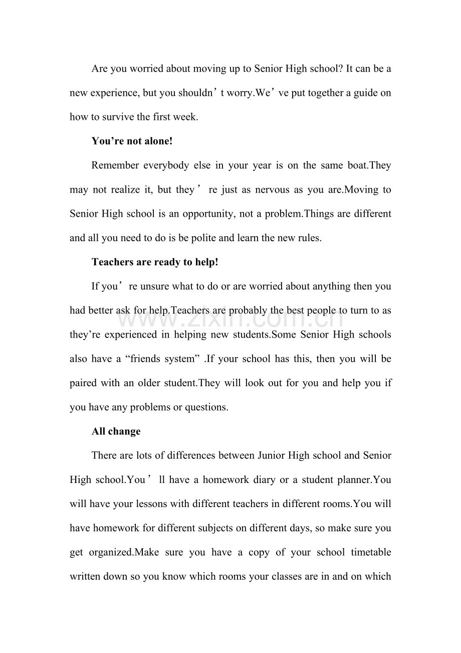 If you’re unsure what to do or are worried about anything then you had better ask for help.Teachers are probably the best people to turn to as they’re experienced in helping new students.Some Senior High schools also have a “friends system” .If your school has this, then you will be paired with an older student.They will look out for you and help you if you have any problems or questions.