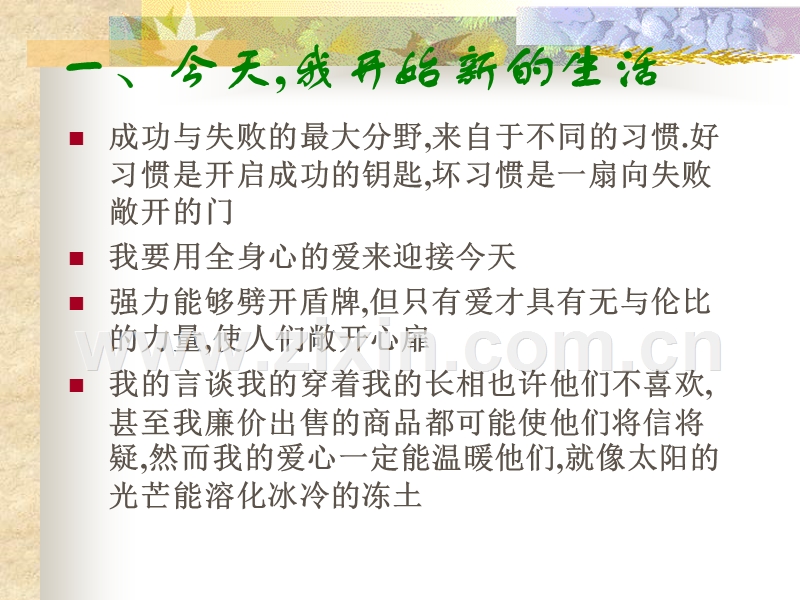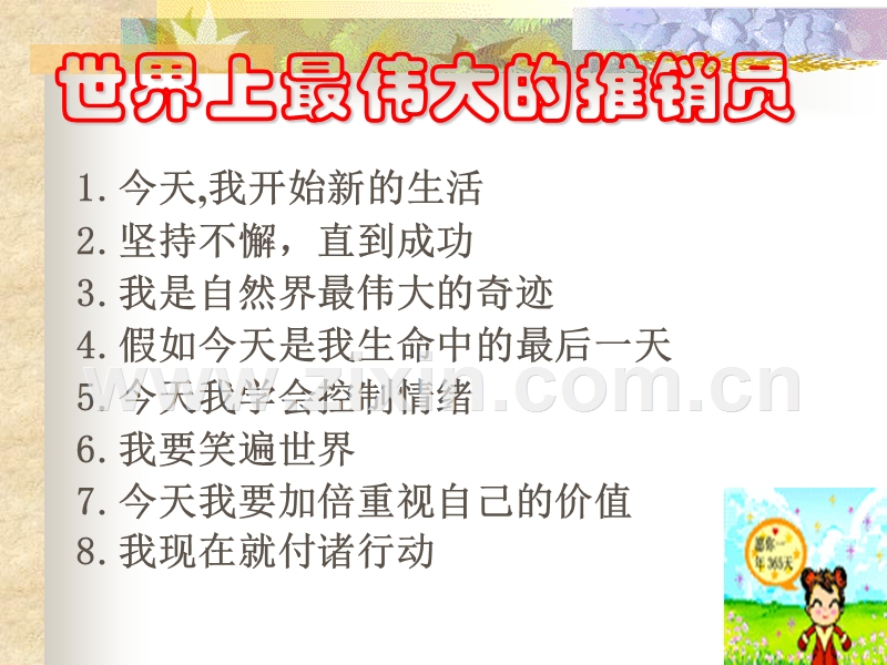 世界上最伟大的推销员,1.今天,我开始新的生活2.坚持不懈,直到成功3.我是自然界最伟大的奇迹4.假如今天是我生命中的最后一天5.今天我学会控制情绪6.我要笑遍世界7.今天我要加倍重视自己的价值8.我现在就付诸行动,一、今天,我开始新的生活,成功与失败的最大分野,来自于不同的习惯.好习惯是开启成功的钥匙,坏习惯是一扇向失败敞开的门我要用全身心的爱来迎接今天强力能够劈开盾牌,但只有爱才具有无与伦比的力量,使人们敞开心扉我的言谈我的穿着我的长相也许他们不喜欢,甚至我廉价出售的商品都可能使他们将信将疑,然而我的爱心一定能温暖他们,就像太阳的光芒能溶化冰冷的冻土,我该怎样做呢?我对一切都要满怀爱心,我爱太阳;我爱雨水;我爱黑夜;我爱光明;我迎接快乐;我忍受悲伤;我接受报酬,因为我为此付出汗水;我不怕困难,因为它们给我挑战我该怎样说呢?我赞美敌人,敌人于是成为朋友;我鼓励朋友,朋友于是成为手足;常想理由赞美,想要批评人时,咬住舌头,想要赞美人时,高声表达我该怎样行动呢?我要爱每个人的言谈举止,我要用爱摧毁困住人们心灵的高墙,我该怎样回应他人的行为呢?用爱心.爱使挫折变得如春雨般温和,它是商场上的护身符:孤独时,给我支持;绝望时,使我振作;狂喜时,让我平静我该怎样面对遇到的每一个人呢?只有一种办法,我要在心里默默地为他祝福.这无言的爱会闪现在我的眼神里,流露在我的眉宇间,让我嘴角挂上微笑,在我的声音里响起共鸣.在这无声的爱意里,他的心扉向我敞开.他不再拒绝我推销的货物!,最主要的,我要爱自己,只有这样,我才会认真检查进入我的身体、思想、精神、头脑、灵魂、心怀的一切东西。我没有时间去恨,只有时间去爱。有了爱,我将成为伟大的推销员。即使才疏智短,也能以爱心获得成功,如果没有爱,即使博学多识,也终将失败。,二、坚持不懈,直到成功,古老的东方斗牛,裁判以它受戳后再向斗牛士进攻的次数多寡来评定勇敢程度我不是为了失败才来到这个世界上的生命的奖赏远在旅途的终点,而非起点附近,再前进一步,事实上,每次进步一点点并不太难,每天的奋斗就像对参天大树的一次砍击,头几刀可能了无痕迹,累积起来,巨树终会倒下我绝不考虑失败,我的字典里不再有放弃、不可能、办不到、没法子、成问题、失败、行不通、退缩。一旦受到绝望的威胁,立即想方设法向它挑战。我放眼未来,勇往直前,不再理会脚下的阻碍。我坚信,沙漠尽头必是绿洲。这一次的拒绝就是下一次的赞同,这一次皱起的眉头就是下一次舒展的笑容。,我要尝试尝试再尝试,障碍是我成功路上的弯路,我迎接这项挑战。像水手一样,乘风破浪当我精疲力竭时,我要抵制回家的诱惑,再试一次。我一试再试,争取每一天的成功,避免以失败收场。我要为明天的成功播种,超过那些按部就班的人。在别人停滞不前时,我继续拼搏,终有一天我会丰收,三、我是自然界最伟大的奇迹,没有一个人和我一样,我是独一无二的造化我不能像动物一样容易满足,我心中燃烧着代代相传的火焰,它激励我超越自己我不再徒劳地模仿别人,而要展示自己的个性物以稀为贵,我独行特立,因而身价百倍。,我要竭尽全力成为群峰之巅,将我的潜能发挥到最大限度我要吸取前人的经验,了解自己以及手中的货物,这样才能成倍地增加销量。我要字斟句酌,反复推敲推销时用的语言,这是成就事业的关键成功一旦降临,就会再度光顾,五、今天我学会控制情绪,如果我们为顾客献上欢乐、喜悦、光明和笑声,他们也会报之以欢乐、喜悦、光明和笑声,我就能获得销售上的丰收,赚取成仓的金币弱者任思绪控制行为,强者让行为控制思绪,沮丧时,我引吭高歌。悲伤时,我开怀大笑病痛时,我加倍工作恐惧时,我勇往直前自卑时,我换上新装不安时,我提高嗓声穷困潦倒时,我相象未来的富有力不从心时,我回想过去的成功自轻自贱时,我想想自己的目标,自高自大时,我要追寻失败的记忆纵情得意时,我要记得挨饿的日子洋洋得意时,我要想想竞争的对手沾沾自喜时,不要忘了那忍辱的时刻自以为是时,看看自己能否让风止步腰缠万贯时,想想那些食不果腹的人骄傲自满时,要想到自己怯懦的时候不可一世时,让我抬头,仰望群星,六、我要笑遍世界,笑有助于消化。笑能减轻压力,笑是长寿的秘方我笑自己,因为自视甚高的人往往显得滑稽这一切都会过去,我要用笑声点缀今天,我要用歌声照亮黑夜。笑声中一切都显露本色只有微笑可以换来财富,善言可以建起一座城堡只有在笑声和快乐中,我才能享受劳动的果食。,七、今天我要加倍重视自己的价值,一颗麦粒,有着三种不同的道路我和一颗麦粒唯一不同在于我有选择的自由,我不会让生命腐烂,也不会让它在失败、绝望的岩石下磨碎,任人摆布,我的生命须有目的方能结出硕果,永远不要担心目标过高,取法乎上,得其中也;取法乎中,得其下也高远的目标不会让我望而生畏,虽然在达到目标以前可能屡受挫折我要成为自己的预言家。虽然大家可能嘲笑我的言辞,但会倾听我的计划,了解我的梦想,因为我无处可逃,直到兑现了诺言,八、我现在就付诸行动,任何宝典永远不能创造财富,只有行动才能使地图、法律、梦想、计划、目标具有现实意义。行动,像食物和水一样,能滋润我,使我成功行动会使猛狮般的恐惧,减缓为蚂蚁般的平